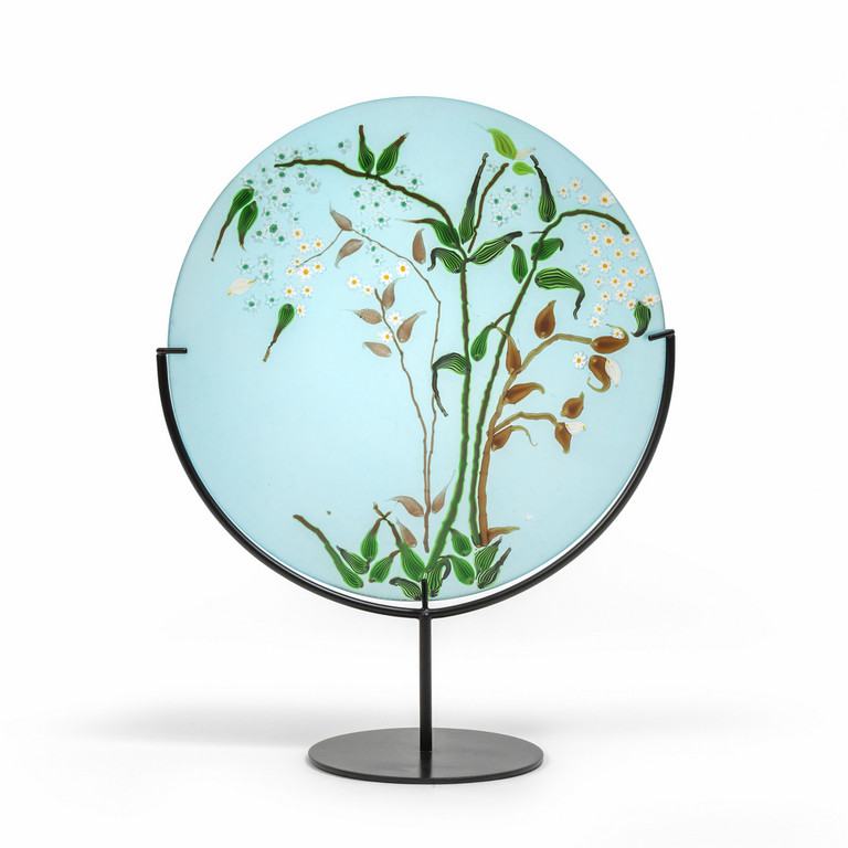 A light blue plate with murrine depicting flowers leaves and stems with its black metal support.