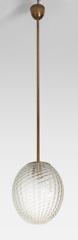 Una lampada a sospensione con struttura di ottone e diffusore in cristallo.