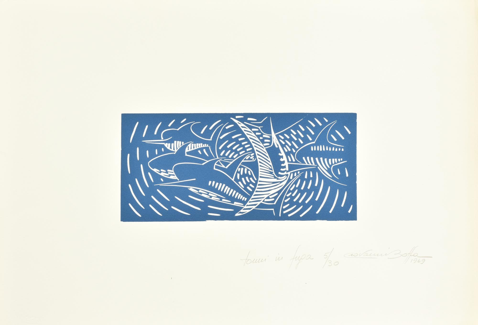 Giovanni Boffa TONNI IN FUGA linoleumgrafia su carta, cm 35,5x51,5; es. 5/30...