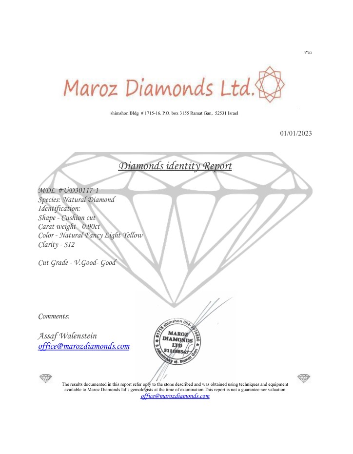 DIAMANTE 0,9 CT FANCY GIALLO CHIARO PUREZZA SI2 - TAGLIO CUSCINO - CERTIFICATO ID - UD30117-1