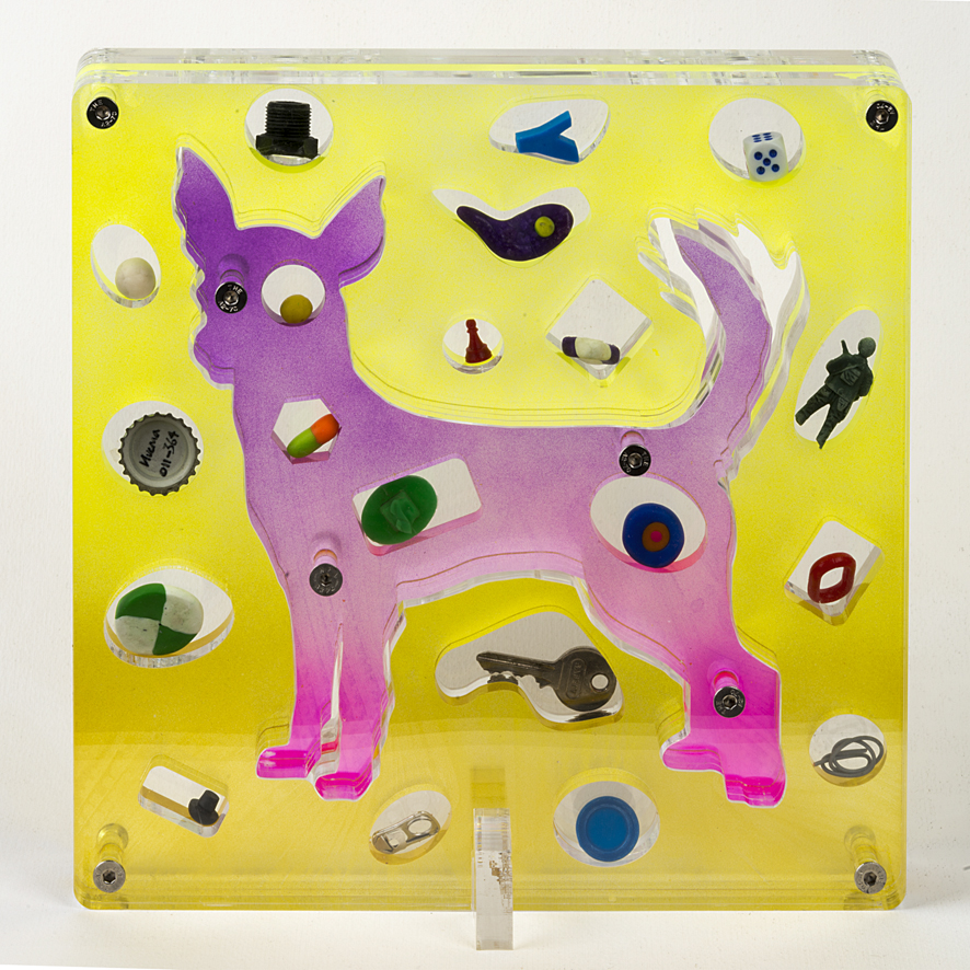 Nucara Renzo Crema 1955 Stratofilm (chihuahua) - 2011 Plexiglass, resine, oggetti 30 x 30 cm Firma e data al centro Autentica dell'artista su foto.