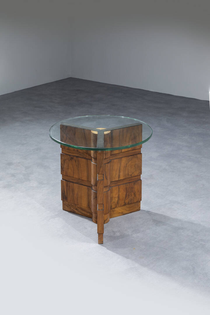 Tavolino con struttura in legno e piano in vetro rotondo.