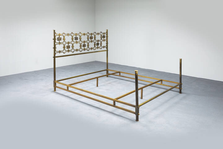 Letto in ottone, piatto in acciaio laccato, formelle in fusione di ottone di Arnaldo e Gio Pomodoro.