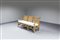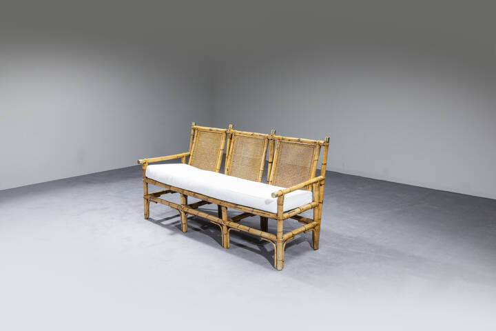 Divano con struttura in bamboo, particolari in ottone, cuscini imbottiti in tessuto.
