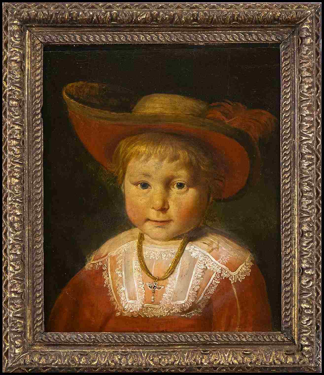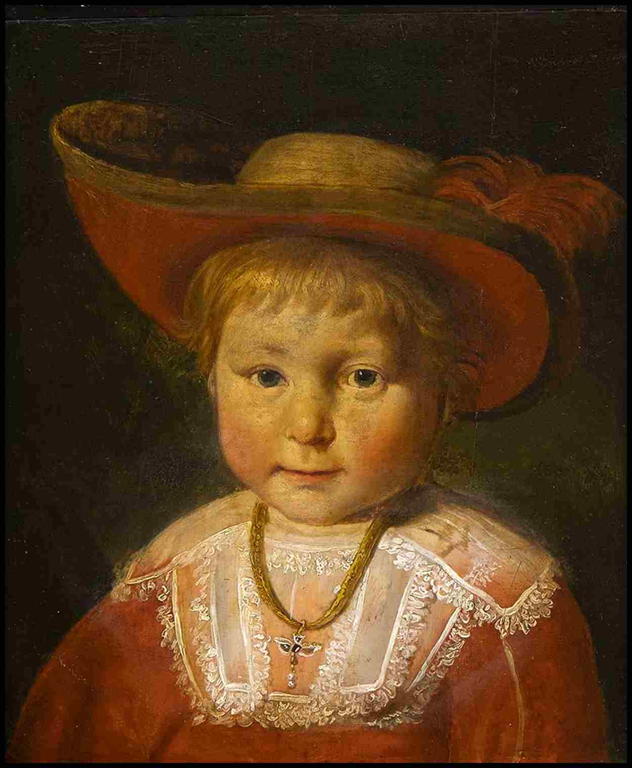 Ritratto di fanciullo con cappello piumato e collana d'oro