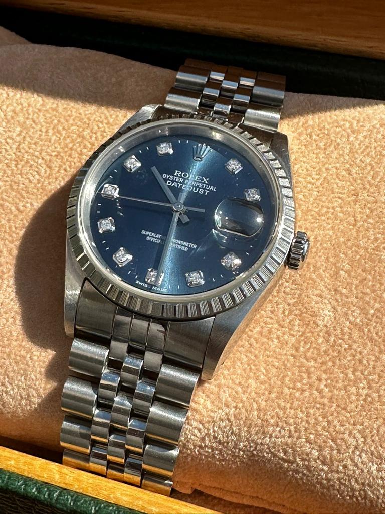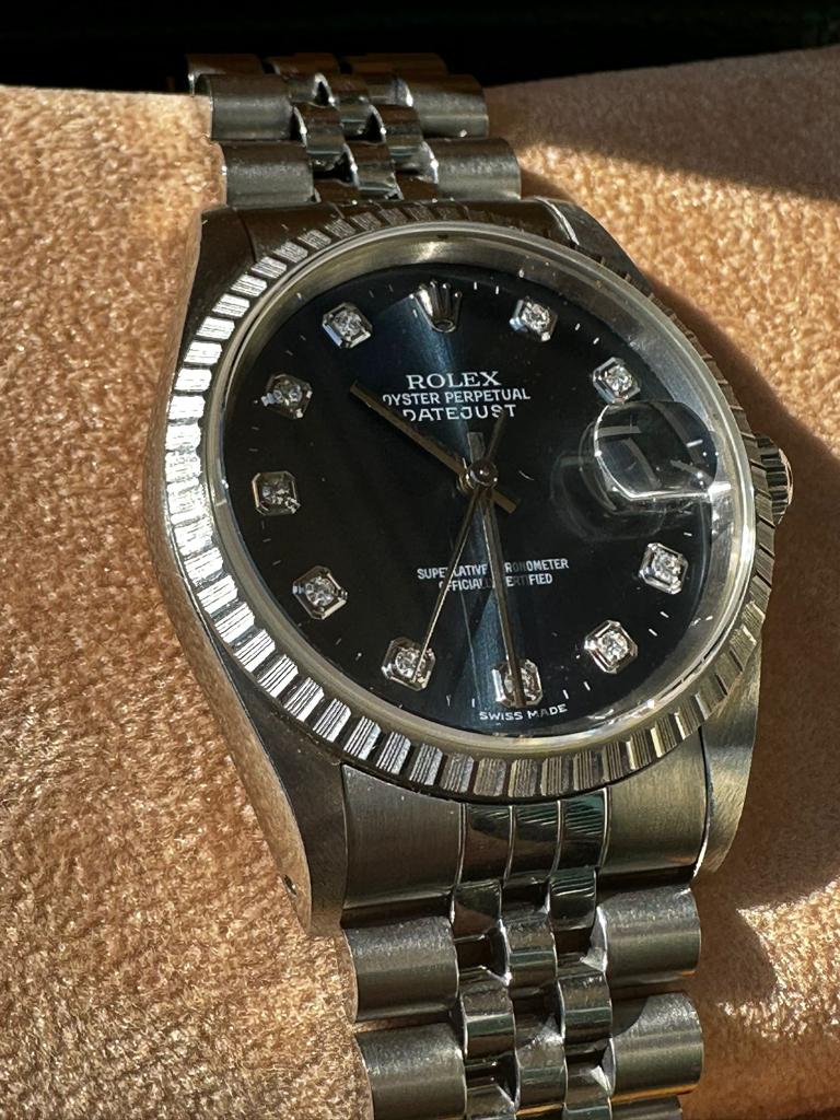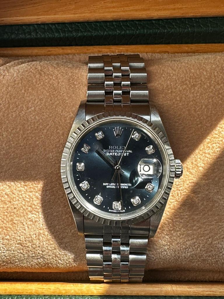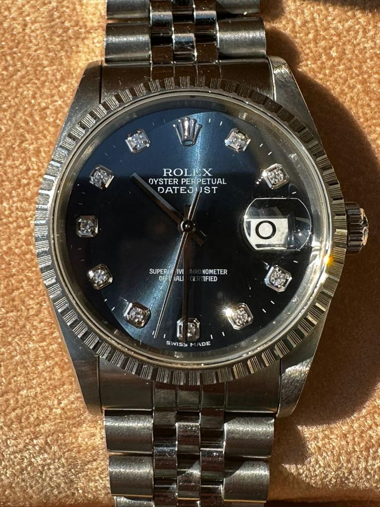 Marca Rolex Modello (Orologio) Datejust 36 Numero di referenza 16220 Carica Automatico Materiale della cassa Acciaio Materiale cinturino Acciaio Anno di produzione 1991 Condizione Ottimo Corredo solo orologio Calibro Carica Automatico Cassa Materiale della cassa Acciaio Diametro 36 mm Impermeabile 5 ATM Materiale lunetta Acciaio Vetro Vetro zaffiro Numeri sul quadrante Senza numeri Cinturino 22 maglie Materiale cinturino Acciaio Colore cinturino Acciaio