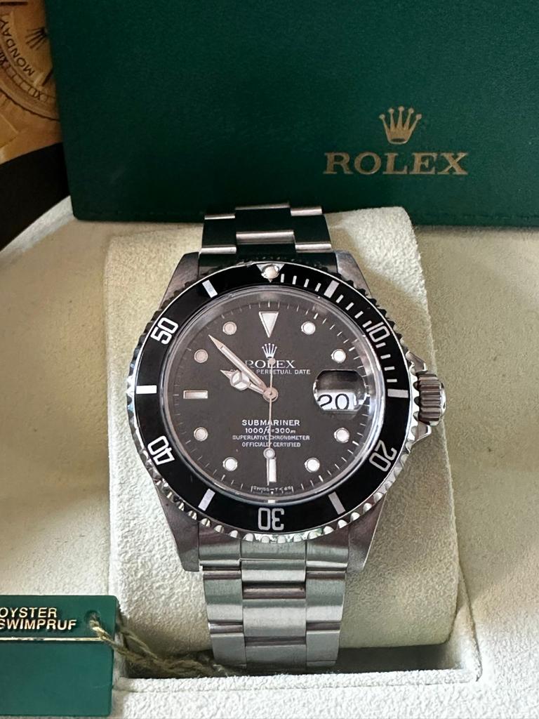 Marca Rolex Modello (Orologio) Submariner Date Numero di referenza 16610 Carica Automatico Materiale della cassa Acciaio Materiale cinturino Acciaio Anno di produzione 1996 Condizione Ottimo (di seconda mano, segni di usura assenti o appena visibili) Corredo Con scatola di fornitura e documenti originali Carica Automatico Cassa Materiale della cassa Acciaio Diametro 40 mm Prova Impermeabile 30 ATM Materiale lunetta Acciaio Vetro Vetro zaffiro Quadrante Nero Numeri sul quadrante Senza numeri Cinturino Materiale cinturino Acciaio Colore cinturino Acciaio Chiusura Déployante Materiale chiusura Acciaio Funzioni Data