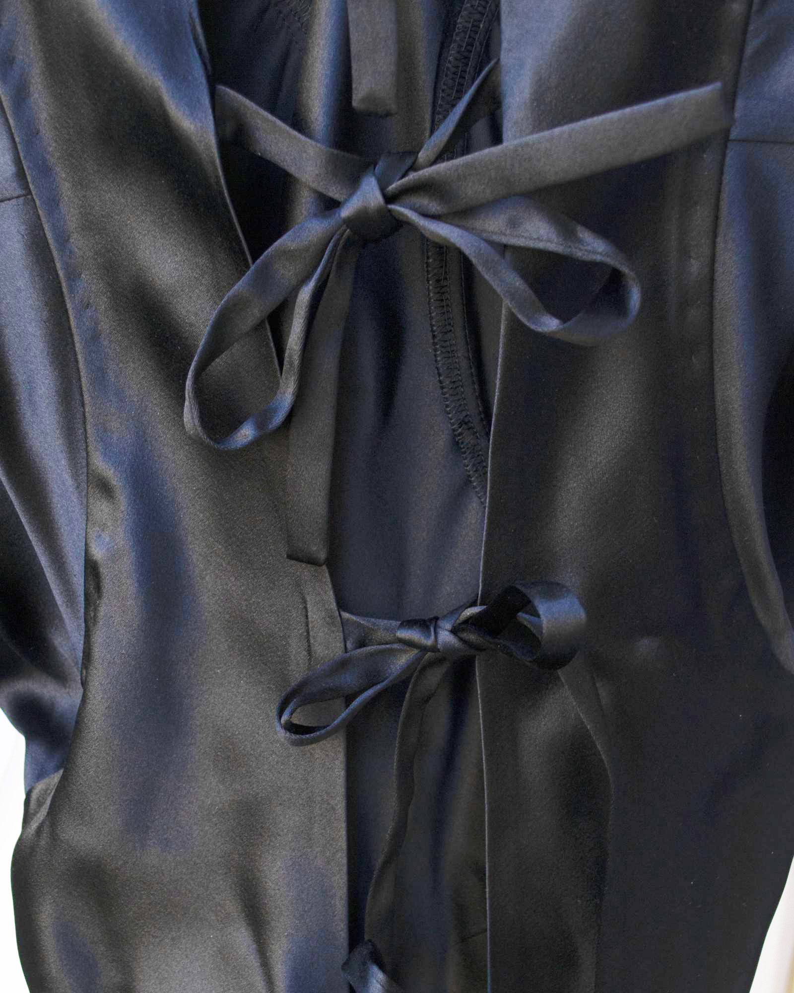 Abito lungo in raso di seta nero, scollo a v, particolare allacciatura con stringhe piatte nello stesso tessuto sul retro e sul fondo maniche taglia unica 10 Uk. Prodotto in Inghilterra negli anni '90. Eccellente stato.