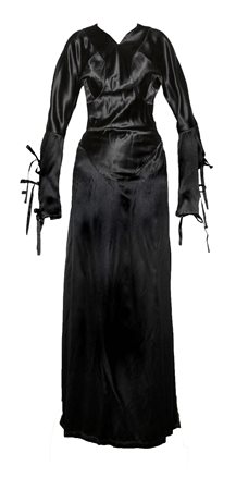 Dress in black silk satin floor lenght small v-neck, particular lacing with flat strings in the same fabric on the back and on the bottom of the sleeves one size 10 Uk. Made in England in the 90s. Excellent condition.