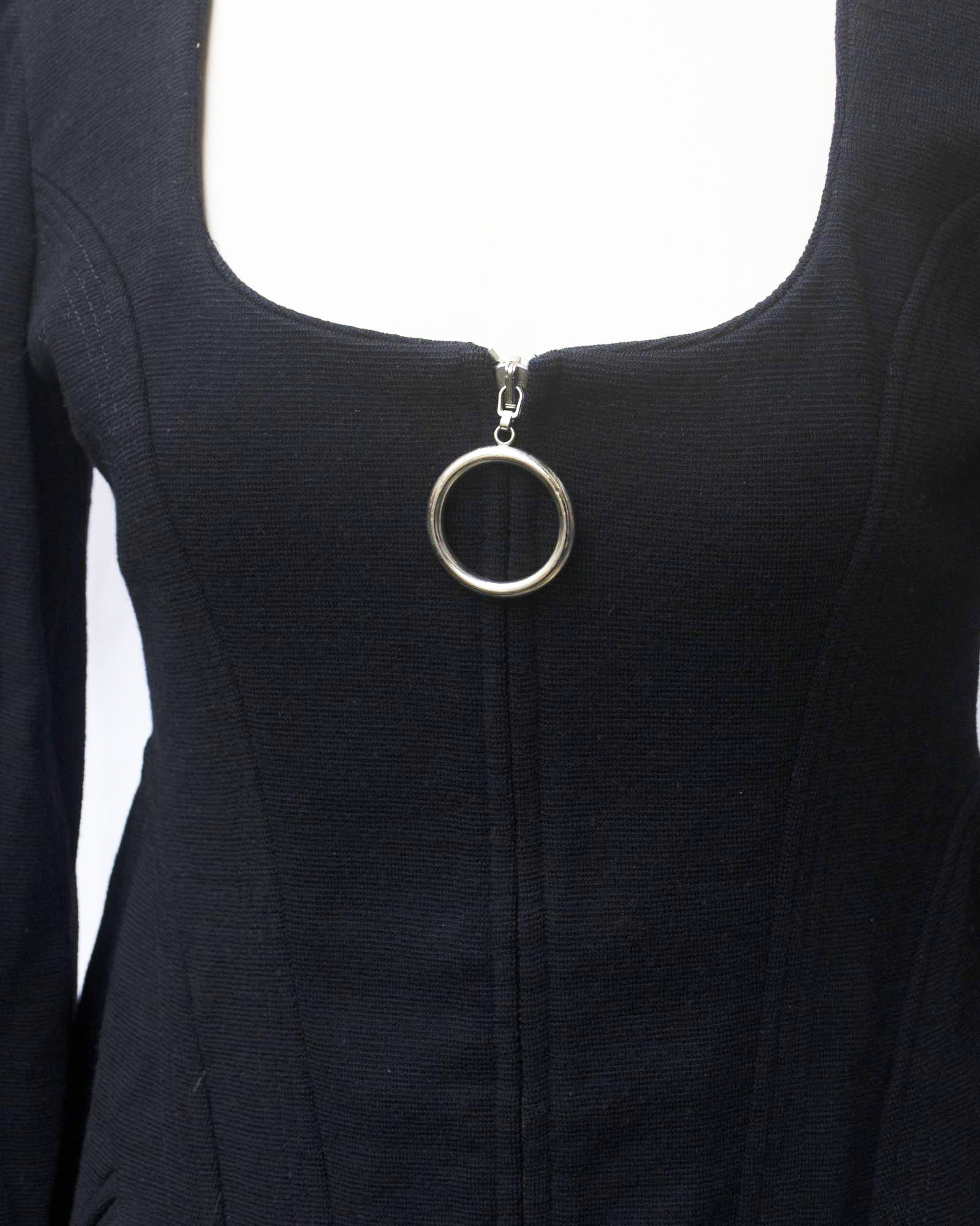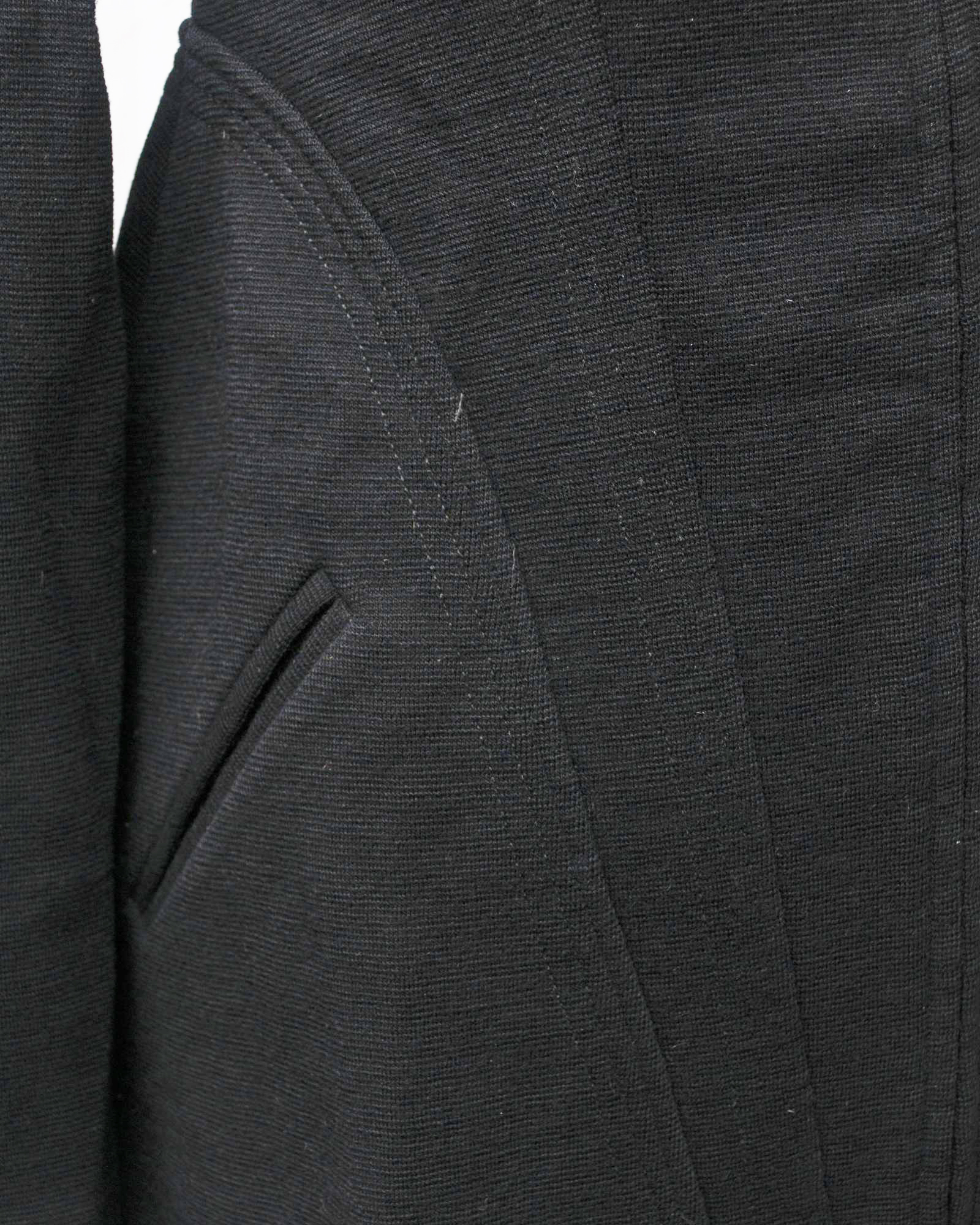 Jersey di lana nera per questo abito mini foderato. Aperto al centro davanti con zip, tasca a fessura sui fianchi, ampio scollo. Prodotto in Italia negli anni '80. Taglia IT 44. Perfettamente Conservato.