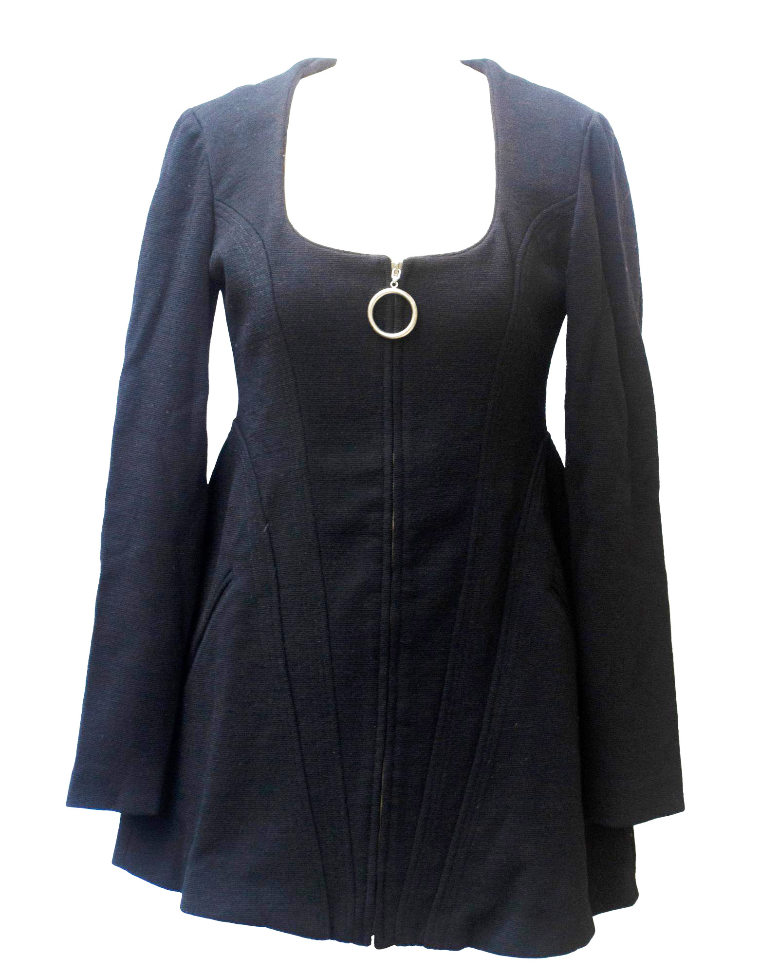Black wool jersey for this lined mini dress. Open in the center front with a zip, slit pocket on the hips, wide neckline. Made in Italy in the 80's. Size IT 44. Perfectly Preserved.