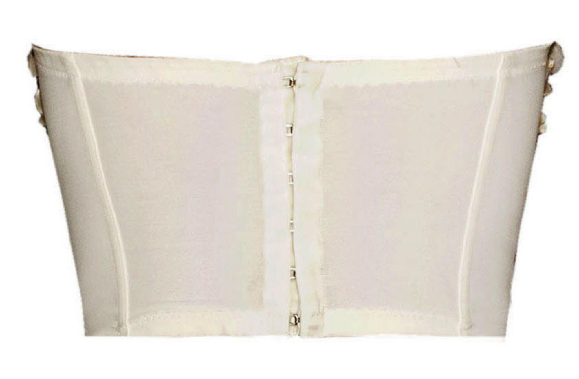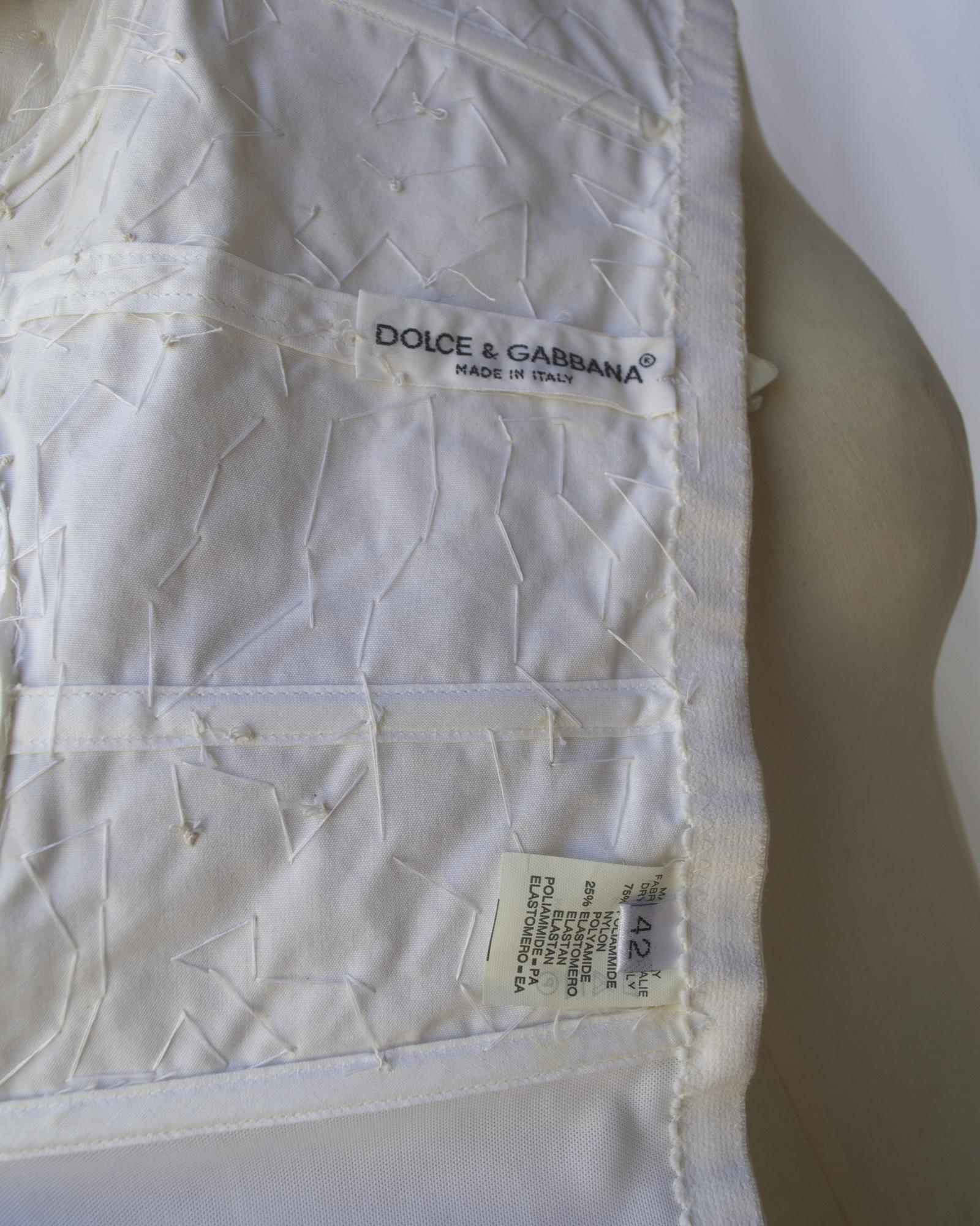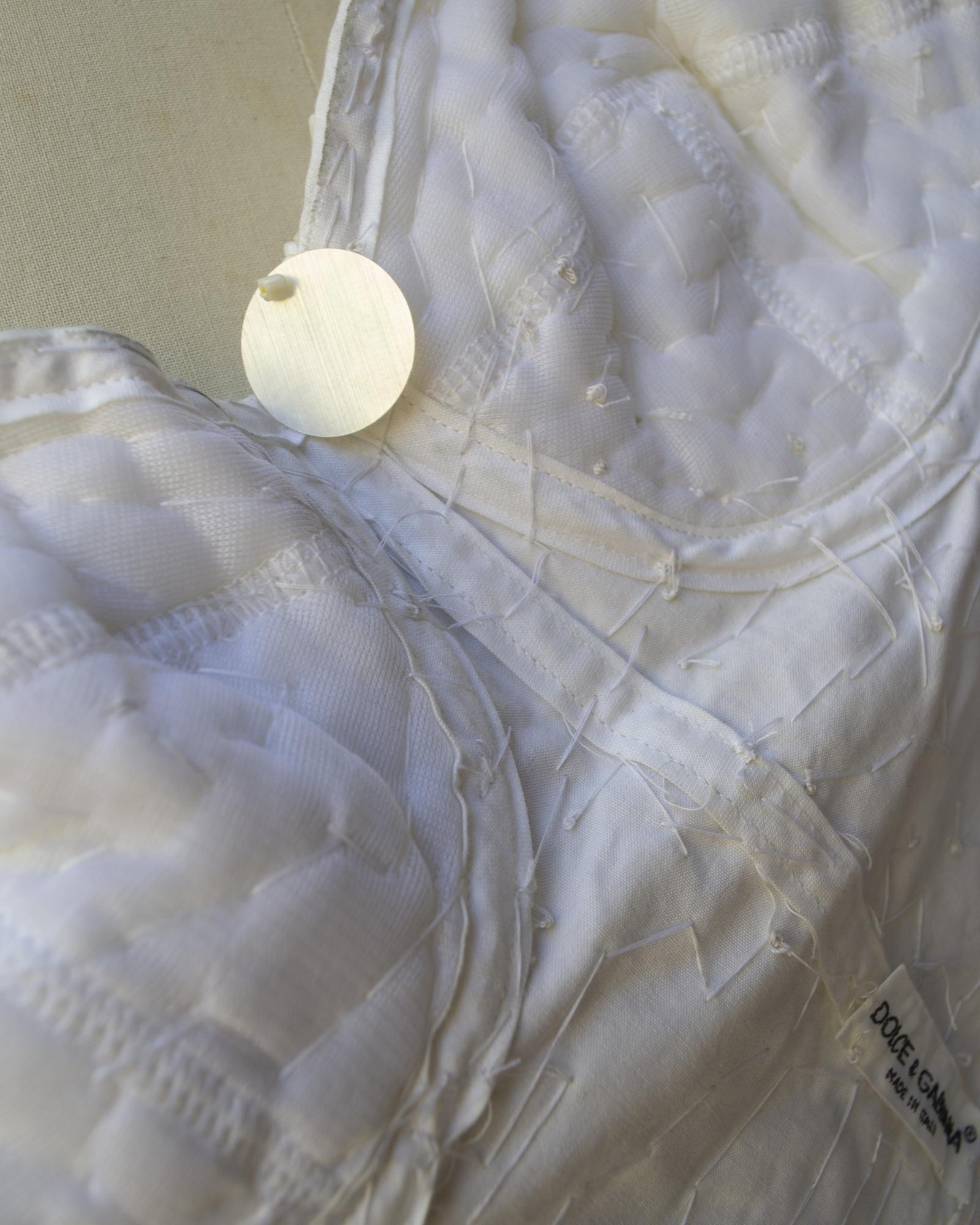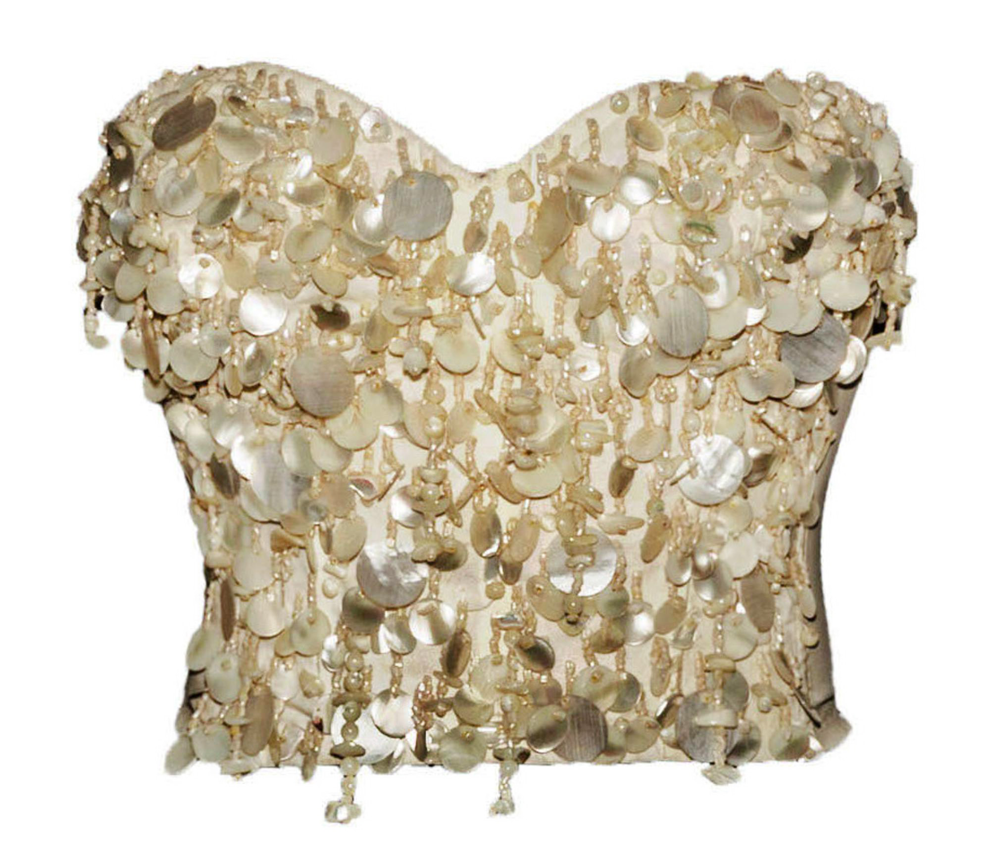 Raro corsetto da collezione del 1987. Fondo bianco completamente ricamato con paillettes in vera madreperla. Mai indossato. Taglia IT42, vestibilita' M, il tessuto di base e' corsetto elastico. Allacciatura centrale dietro con ganci. Made in Italy. Eccellente stato.