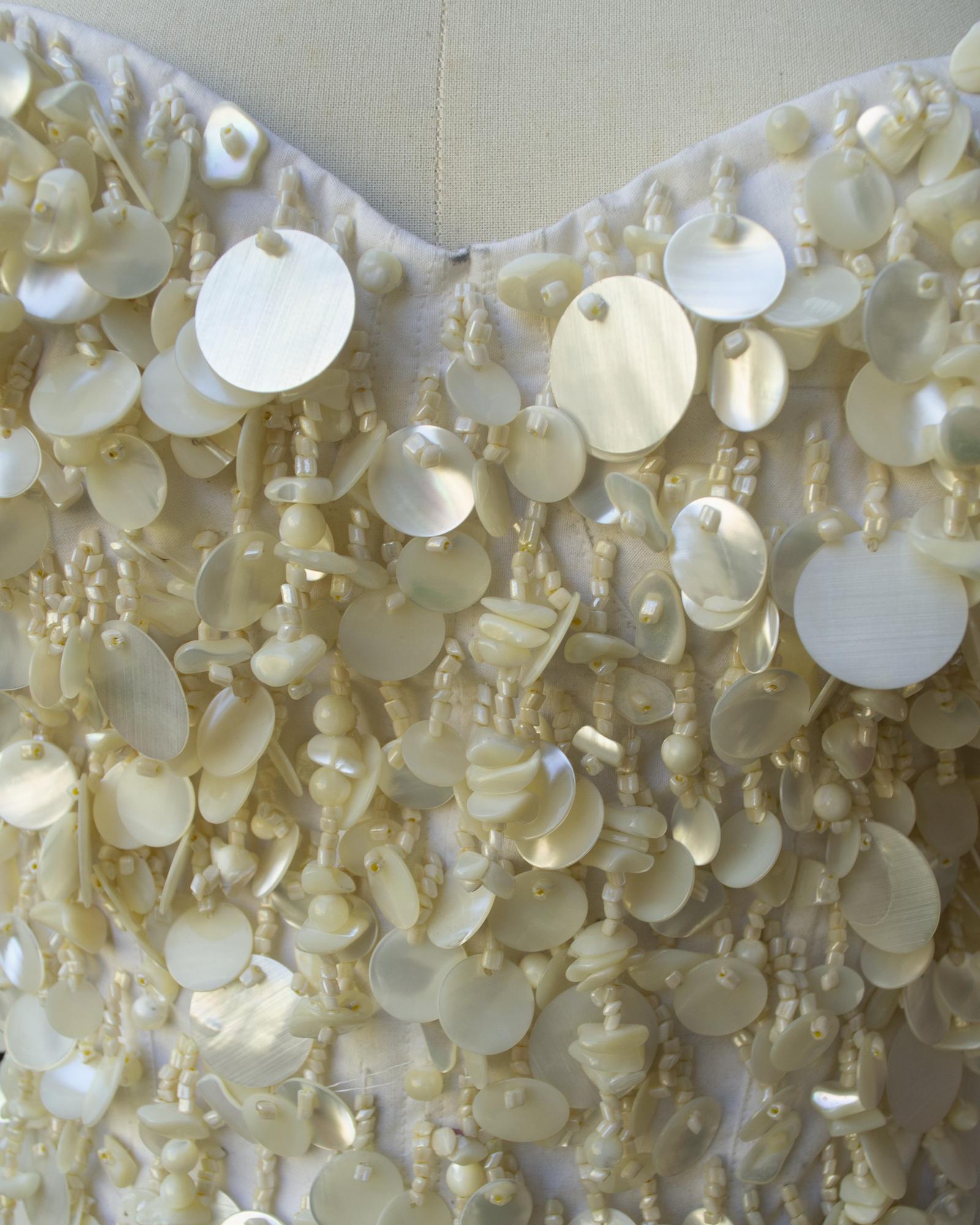Rare collectible corset from 1987. White background completely embroidered with real mother-of-pearl sequins. Never worn. Size IT42, fit M, the basic fabric is elastic corsetry. Center back lacing with hooks. Excellent condition.
