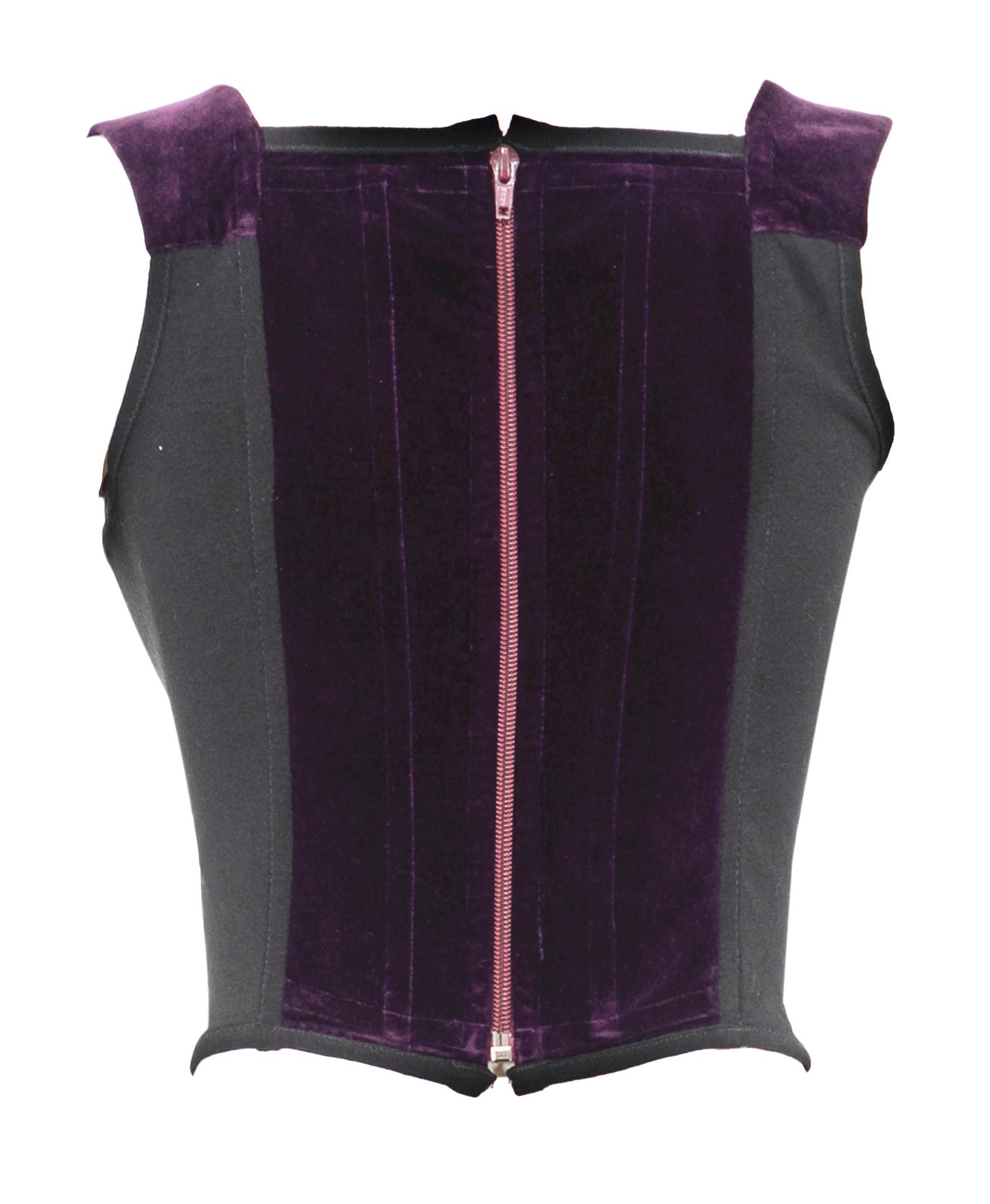 Iconic and rare dark purple velvet bustier from the 90's, black jersey sides, inner whalebons and visible stitchings, zip at back. Size IT 44.