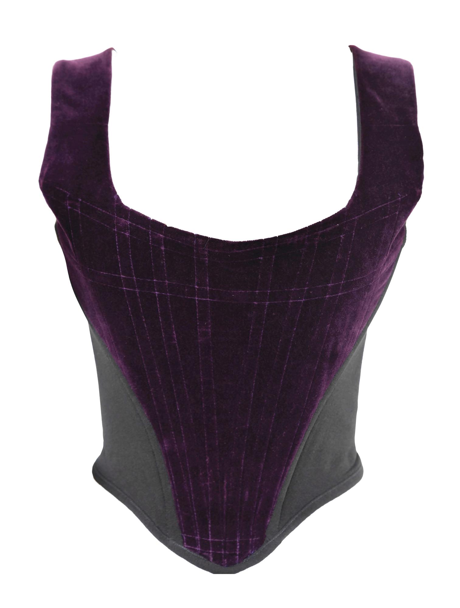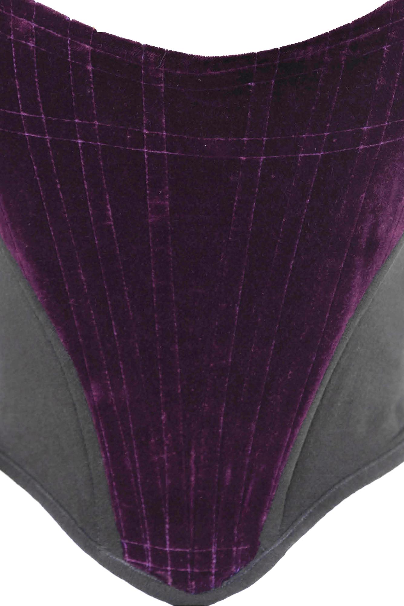 Iconico e raro bustier anni '90 in velluto viola scuro, fianchi in jersey nero, stecche di balena interne e impunture a vista, zip sul dietro. Taglia IT 44.
