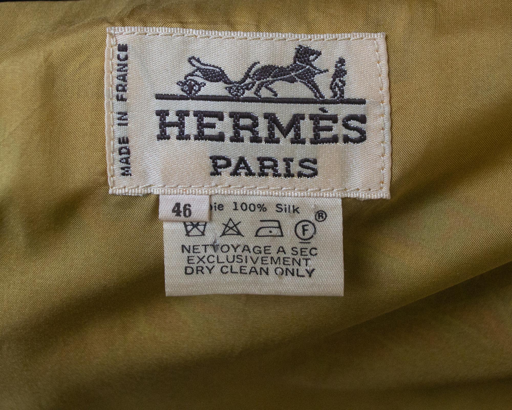 Twill di seta stampato 'Art des Steppes' per questo gilet Hermes. Bottoni ricoperti in tessuto stesso al centro davanti. Due tasche a filetto. Prodotto in Francia primi anni '90. Taglia francese 46 (media). Perfettamente conservato.
