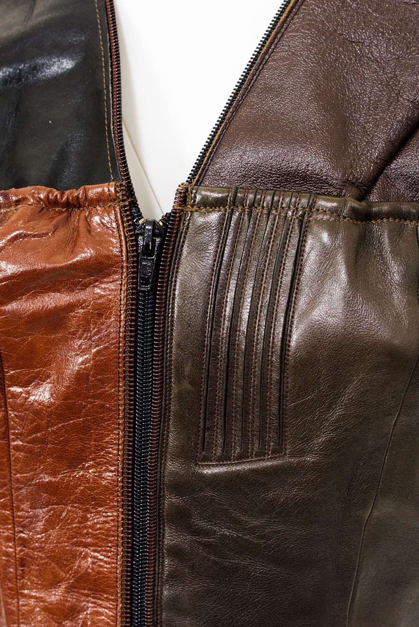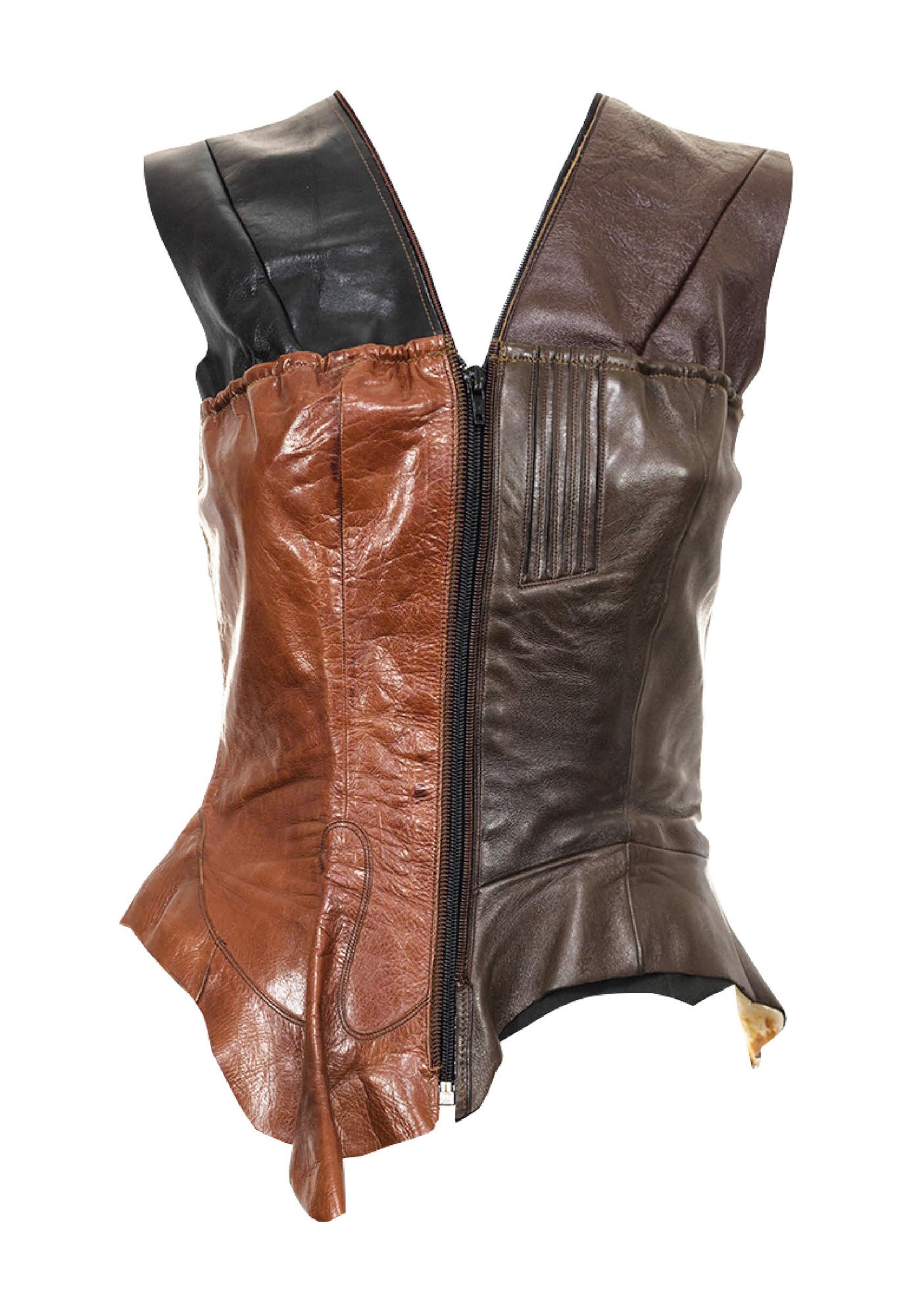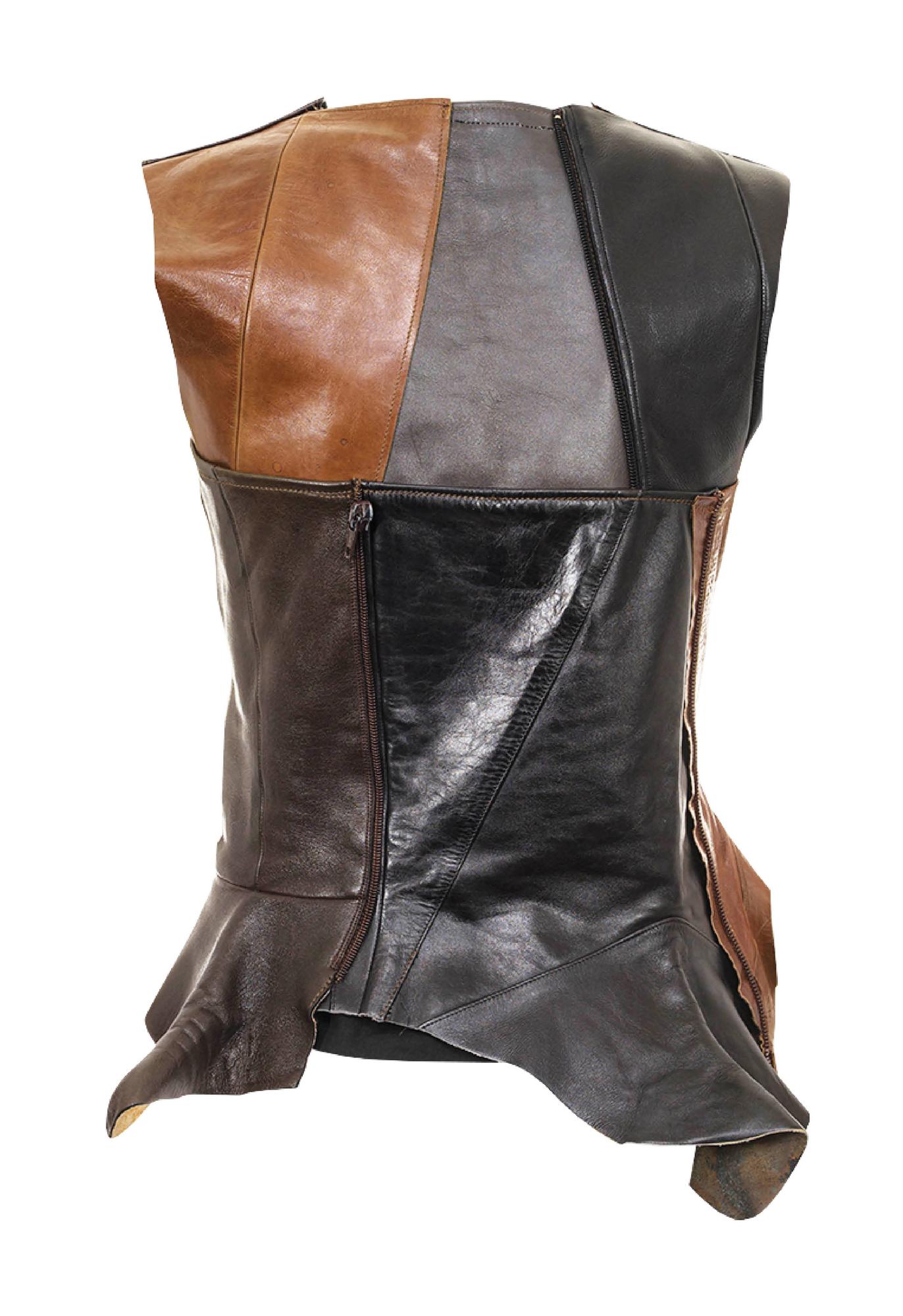 Rare Artisanal zippered leather vest from SS 01 collection, made with multicolored vintage leather gaiters, zip at front and fully lined, size IT 42.