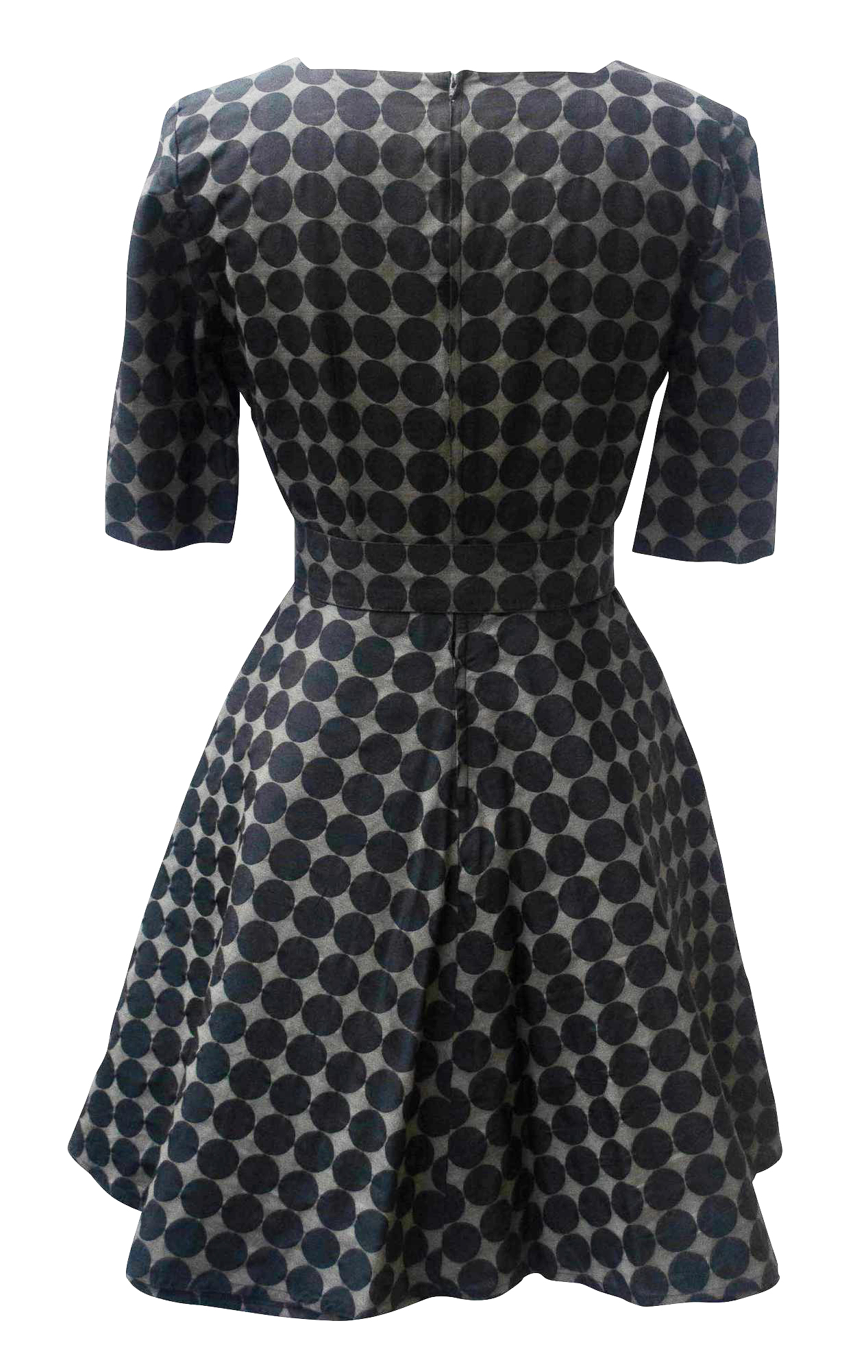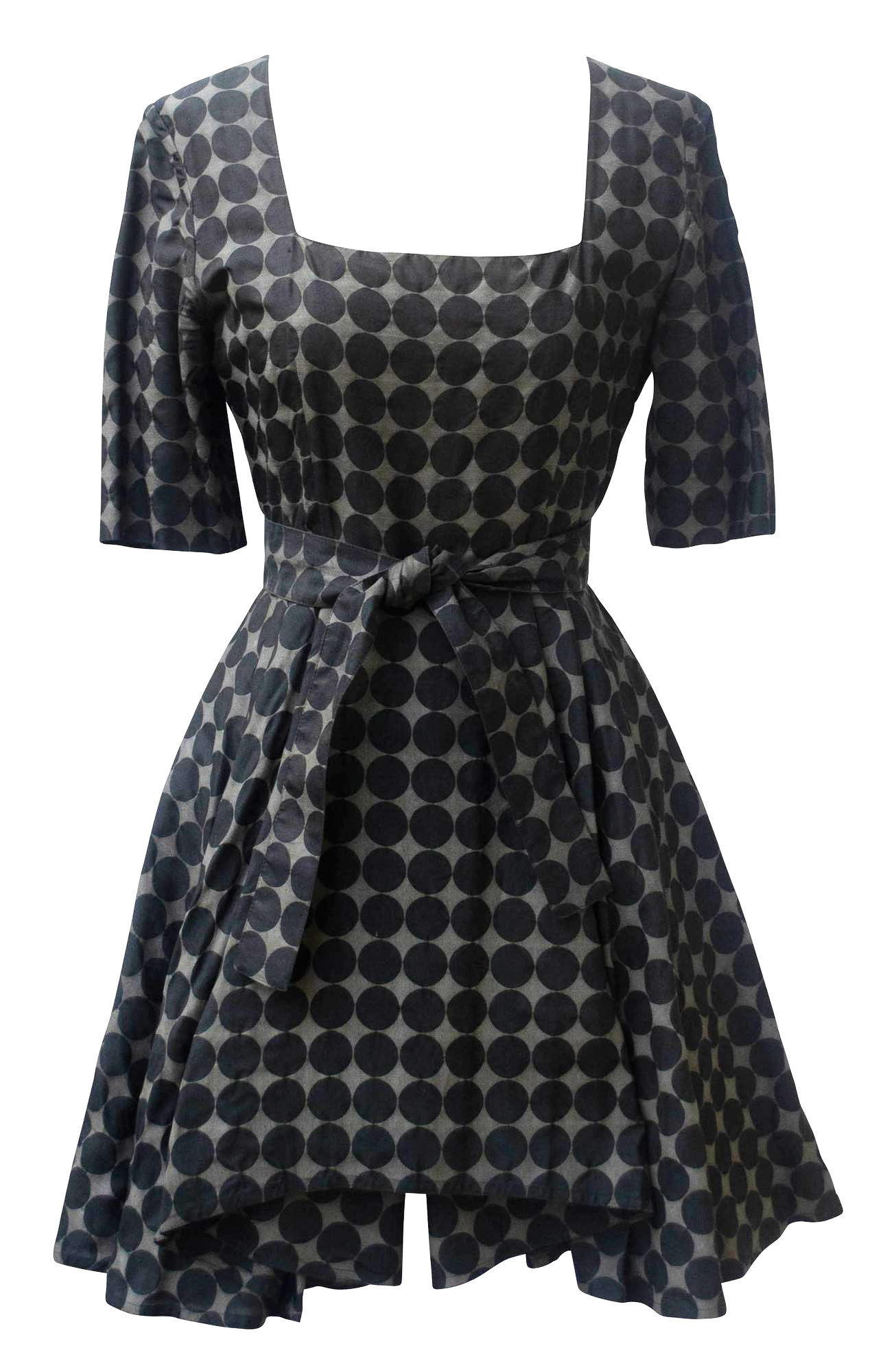 Dress in dark grey dots printed. Belt, short sleeves, under skirt in crinolina to support the characteristic A-Line shape. Zip at the center back, generous square neckline. IT Size 42. Made in Italy in the middle 80s. Perfectly preserved.
