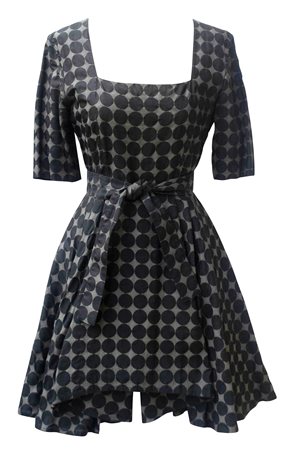 Abito a pois grigio scuro stampato. Cintura, maniche corte, sottogonna in crinolina per sostenere la caratteristica forma ad A. Zip al centro dietro, ampio scollo quadrato. IT Taglia 42. Prodotto in Italia a meta' degli anni '80. Perfettamente conservato.