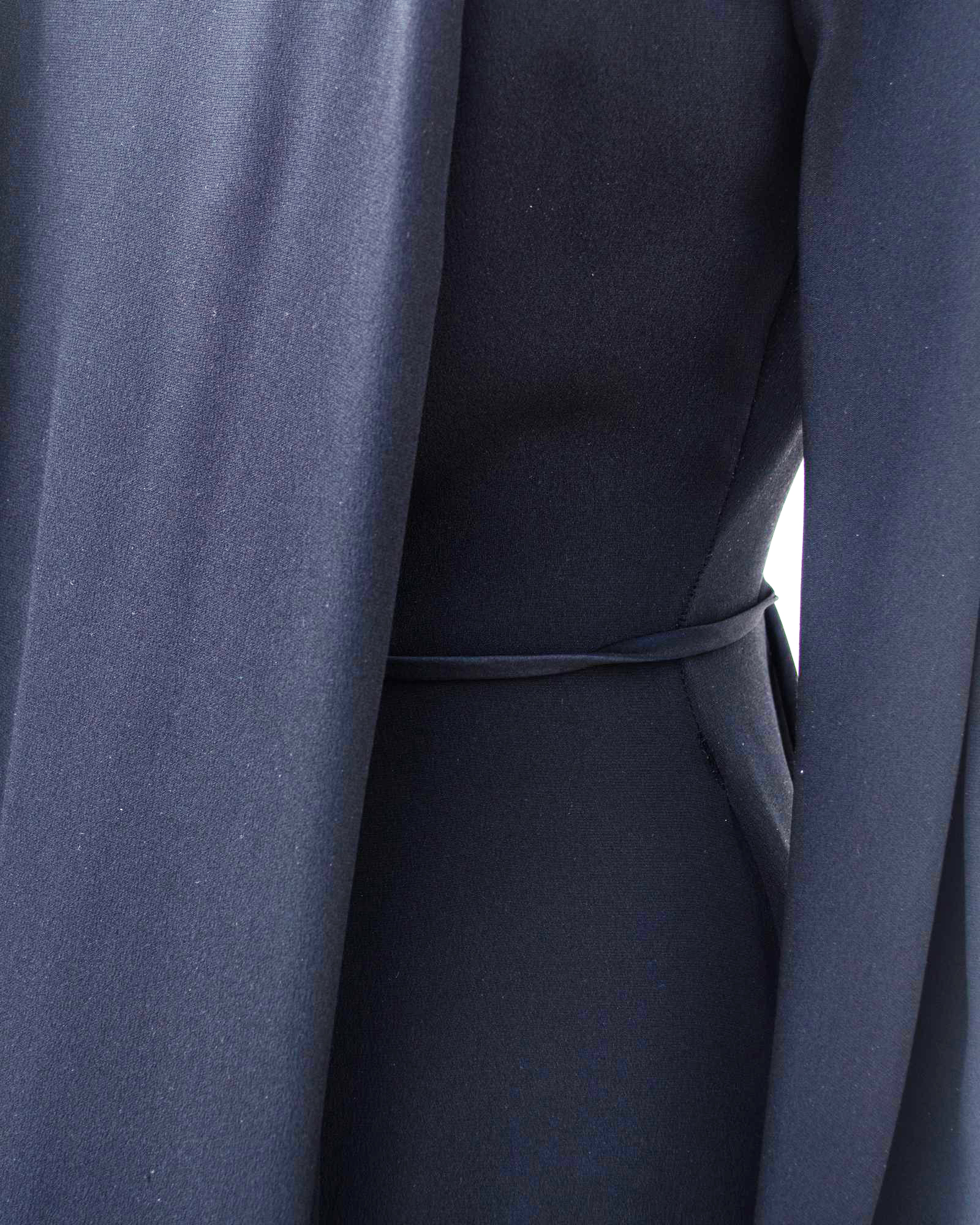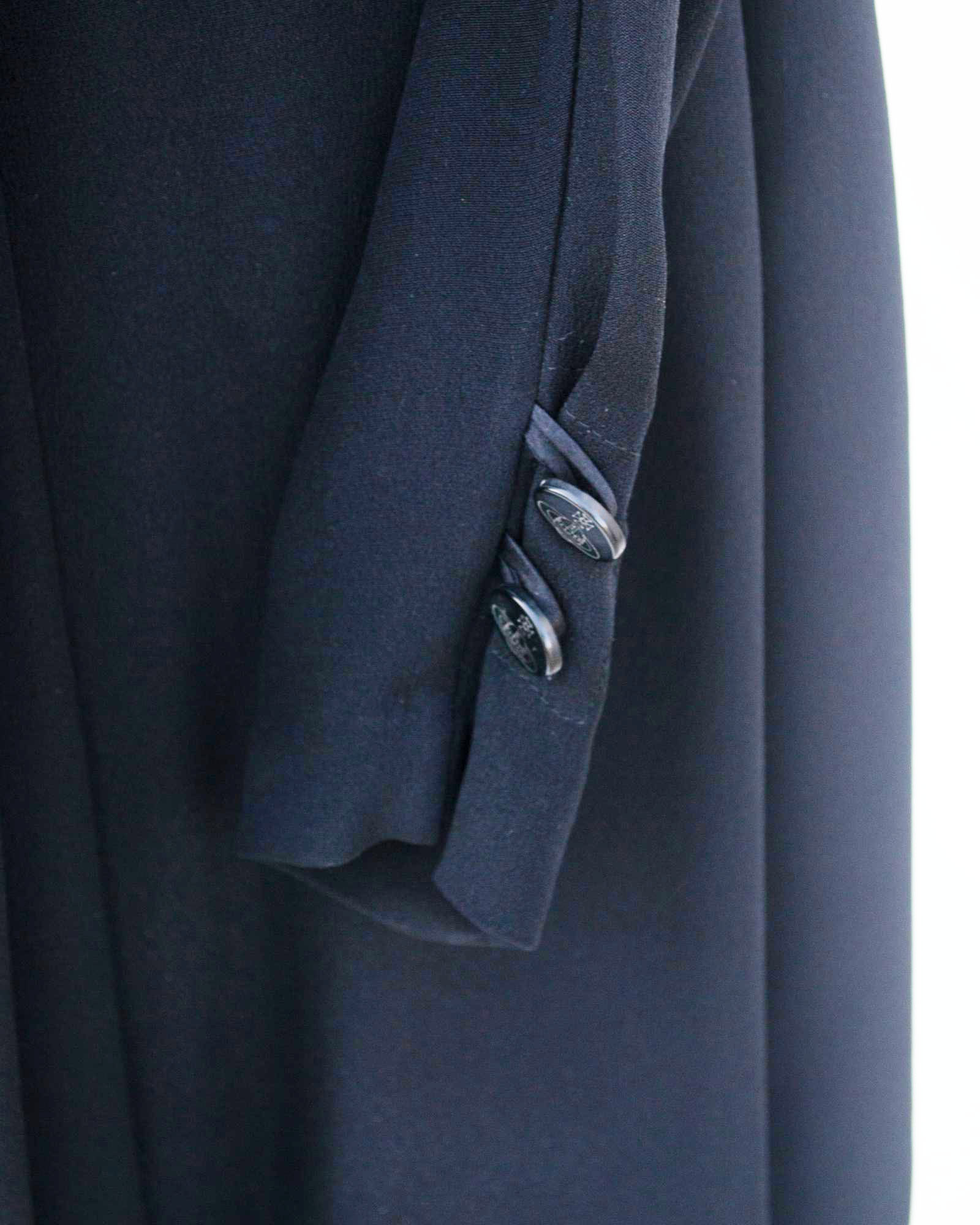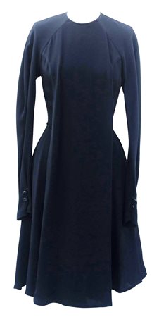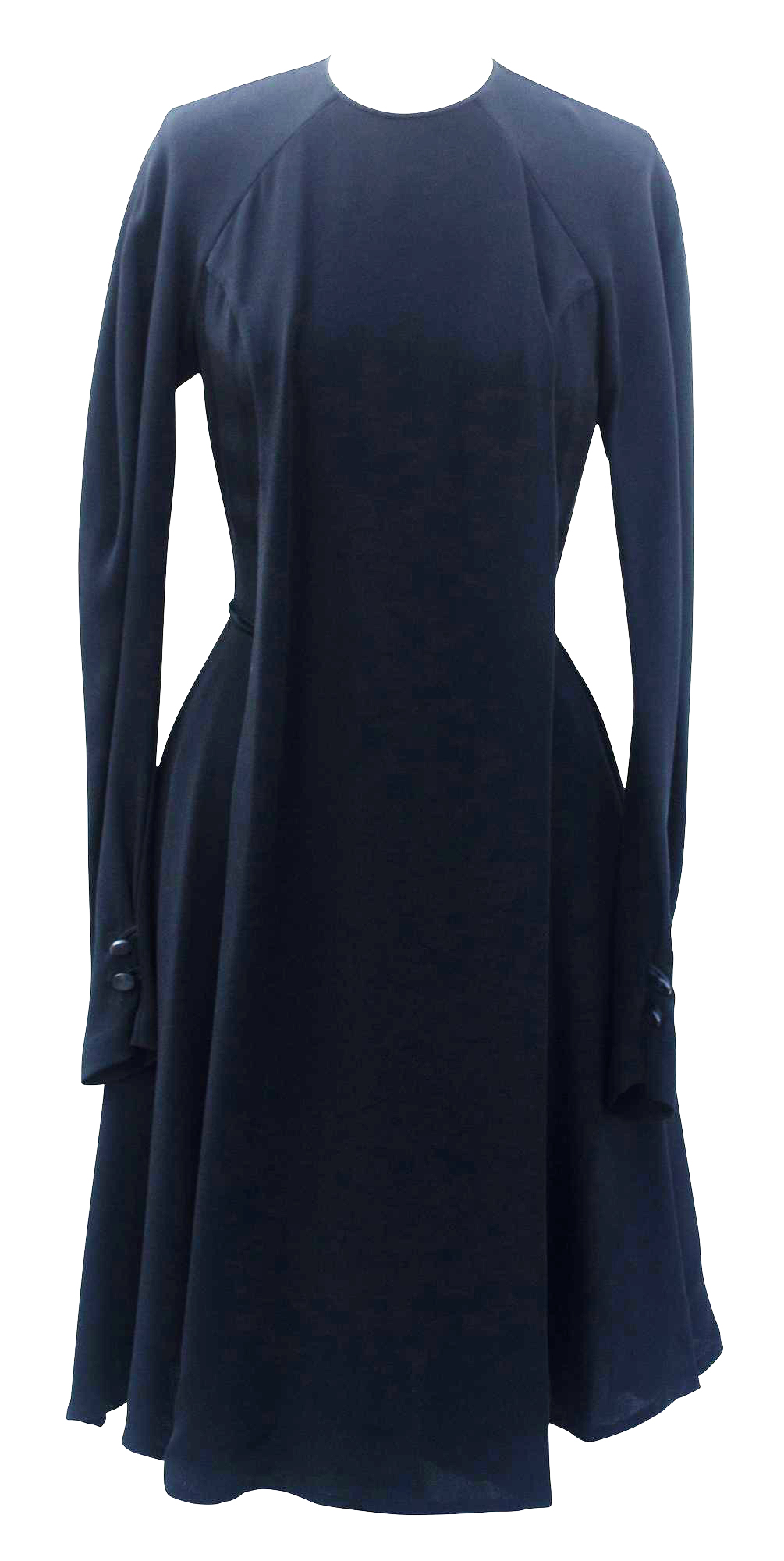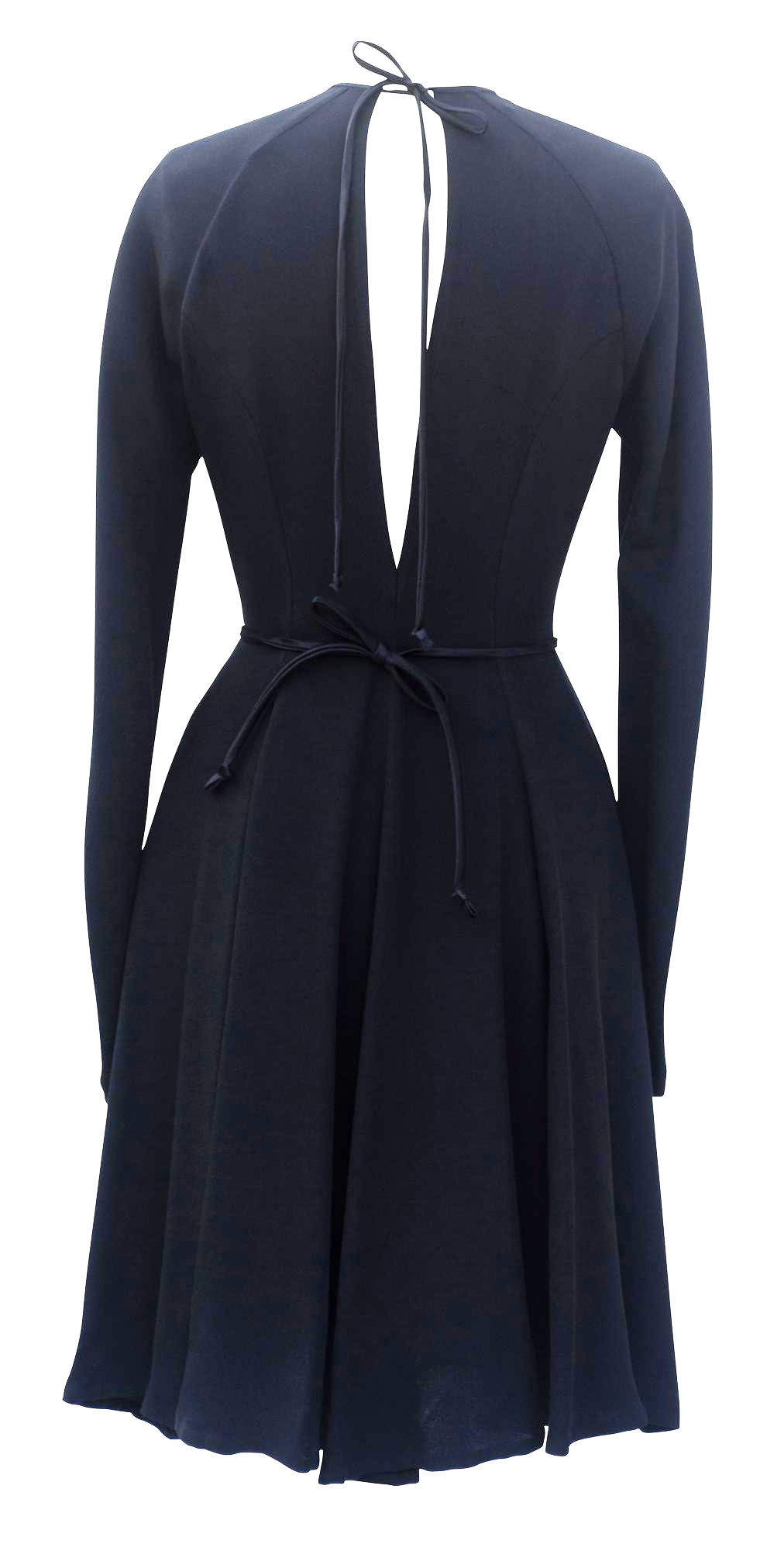 Description:Flared Dress in silk crepe cady black, cocktail dress with a deep slit on the back trimmed collar with satin ribbon. Also a satin ribbon is used to adjust the waist line. Special Made in Gold Label in the 90s. Made in England, UK size 10. Perfectly preserved.