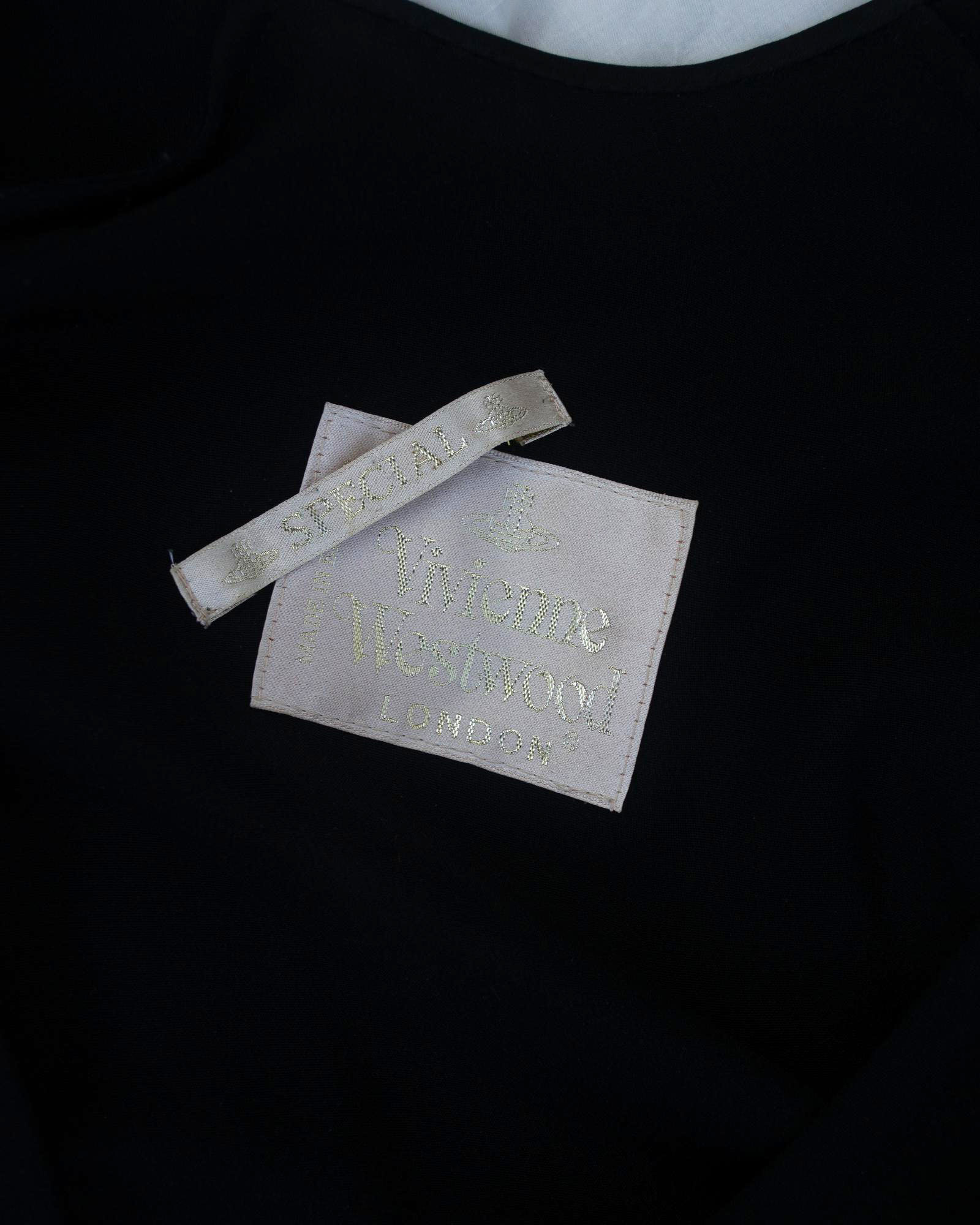 Descrizione:Abito svasato in crepe di seta cady nero, abito da cocktail con profondo spacco sul retro-collo bordato con nastro di raso. Un nastro di raso viene anche utilizzato per regolare il punto vita. Speciale Made in Gold Label negli anni '90. Made in England taglia UK 10. Perfettamente conservato.