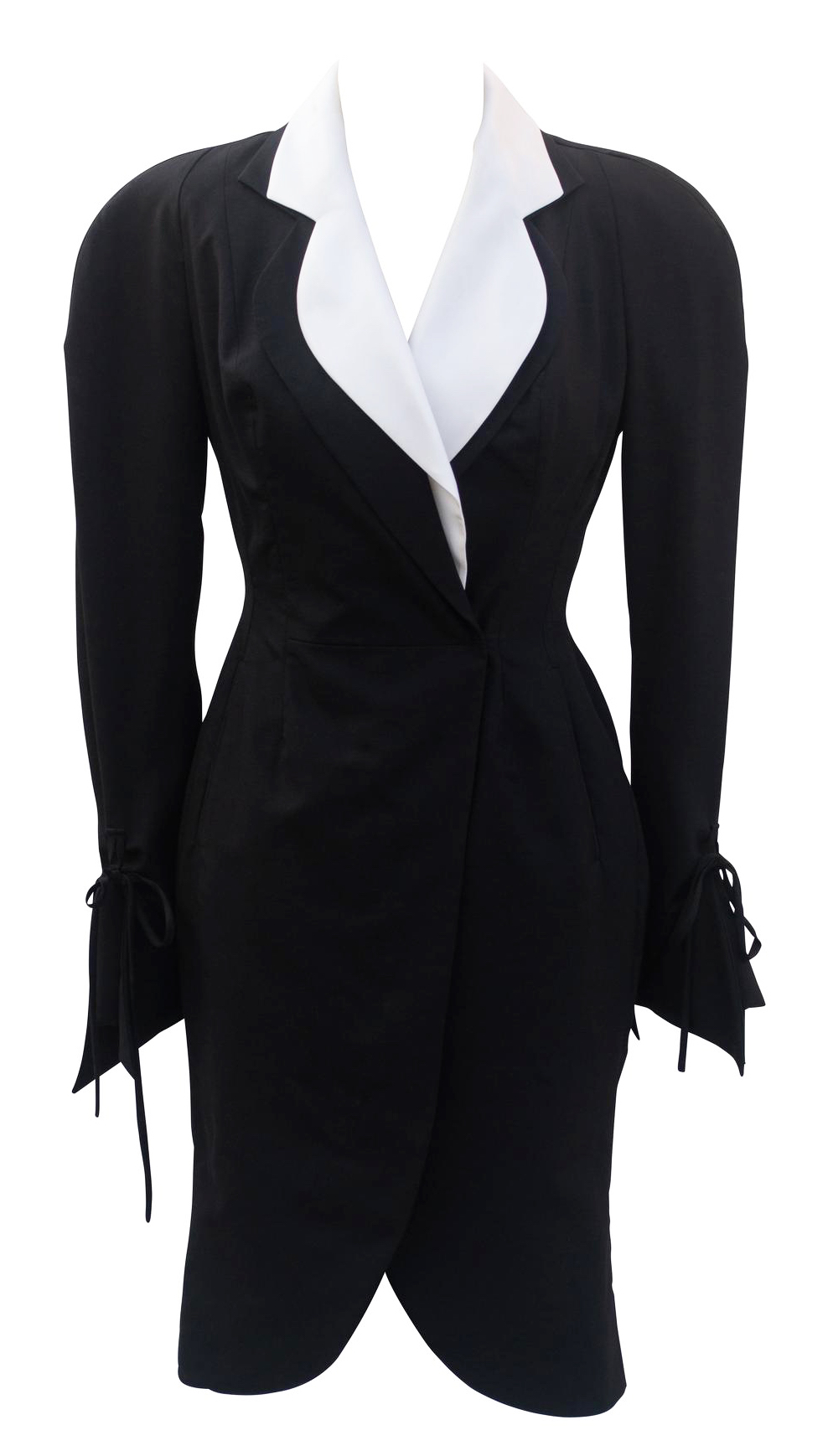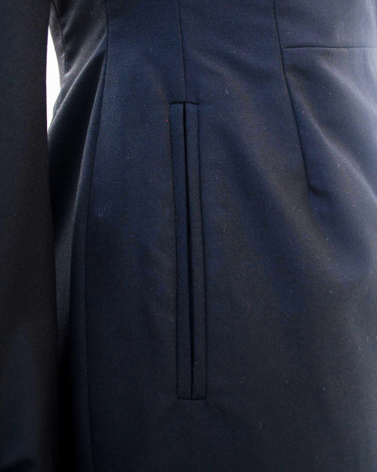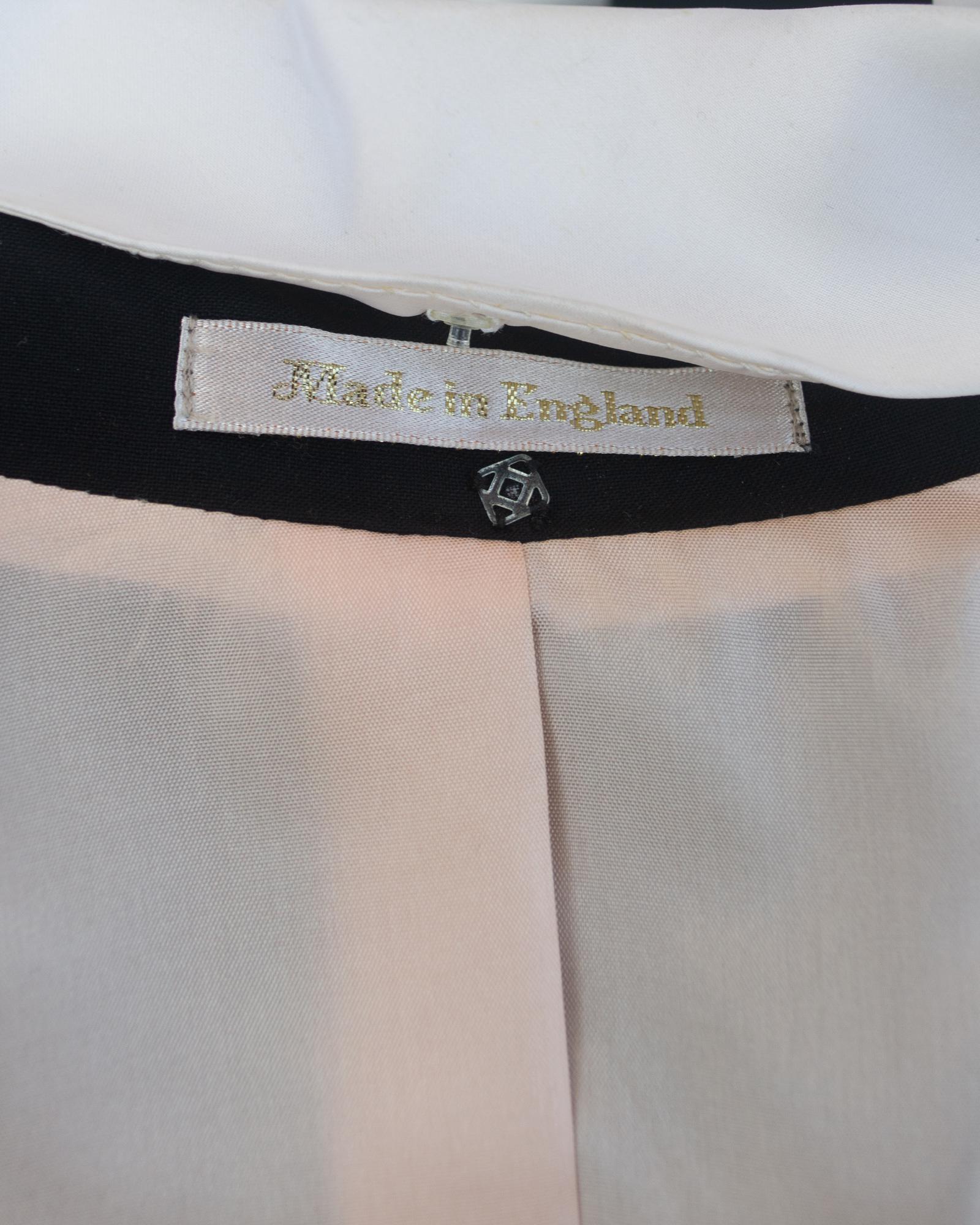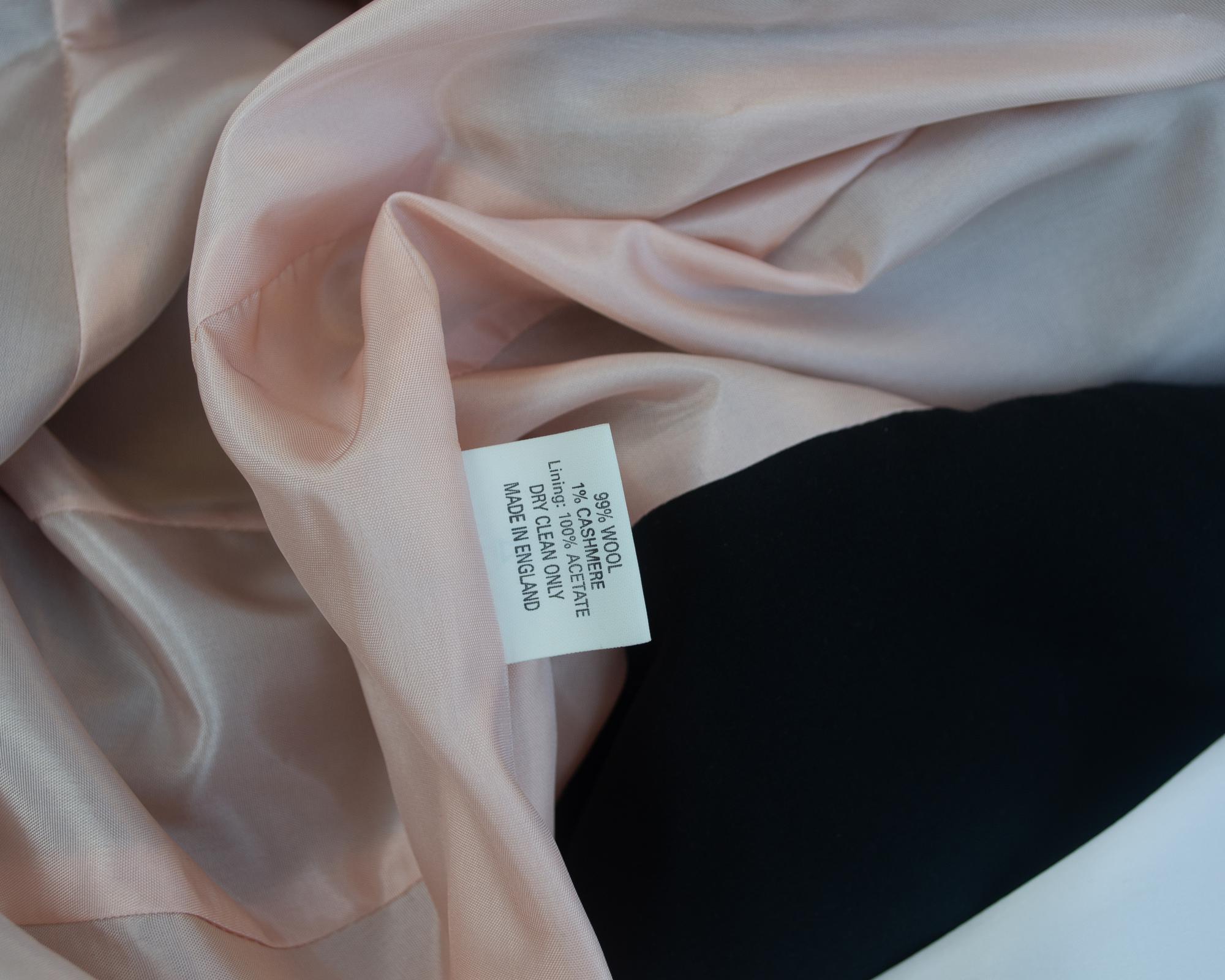 Abito realizzato in tessuto di lana mohair e cashmere Hield, con collo staccabile in organza di seta bianca e revers. Tasche a doppio filetto, bottoni smaltati con logo Orb. Fodera rosa, Made in England negli anni '90. Eccellente stato.