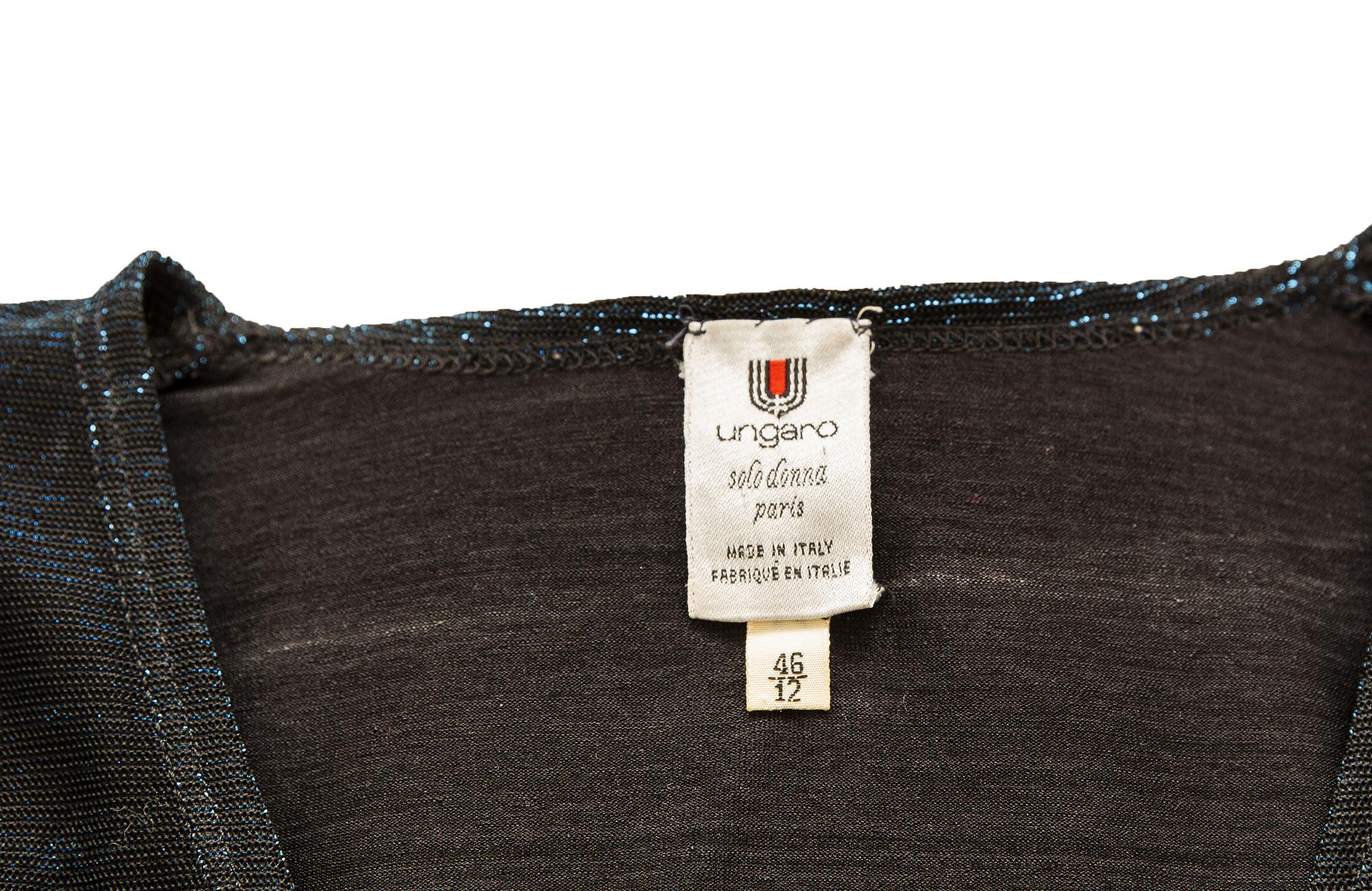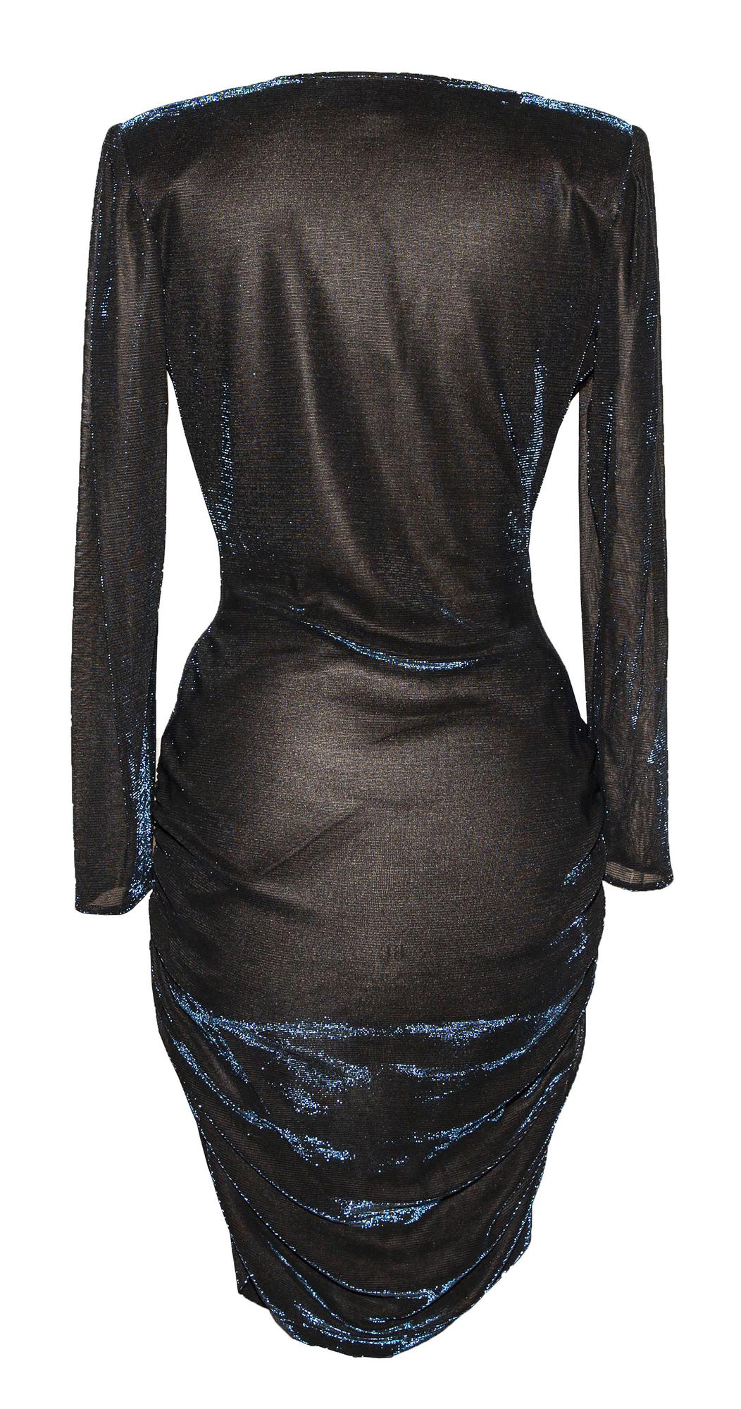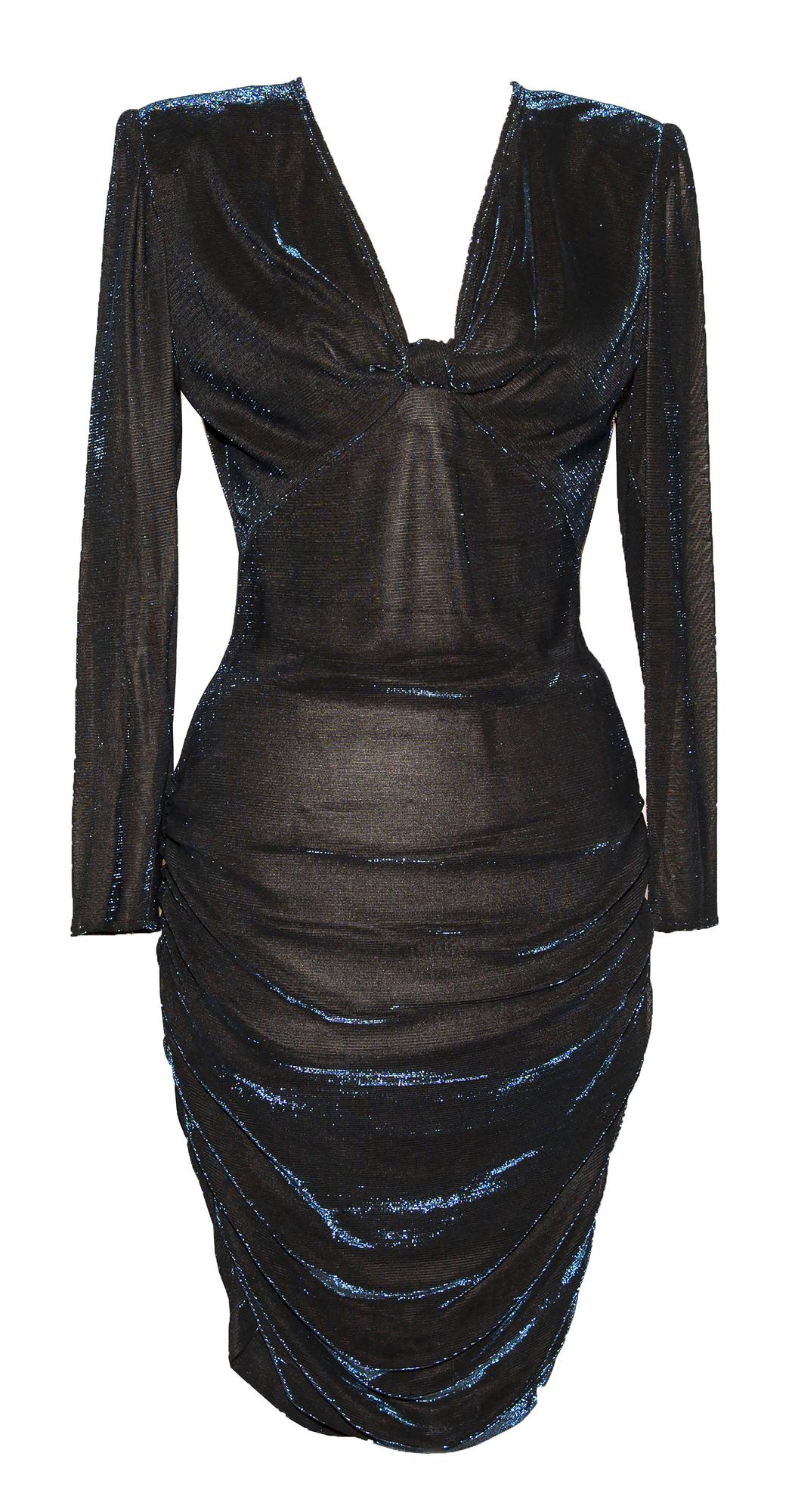 Abito in jersey di lurex stretch iridescente blu su fondo nero. Made in Italy. Taglia 46. Anni '80. Perfettamente conservato.