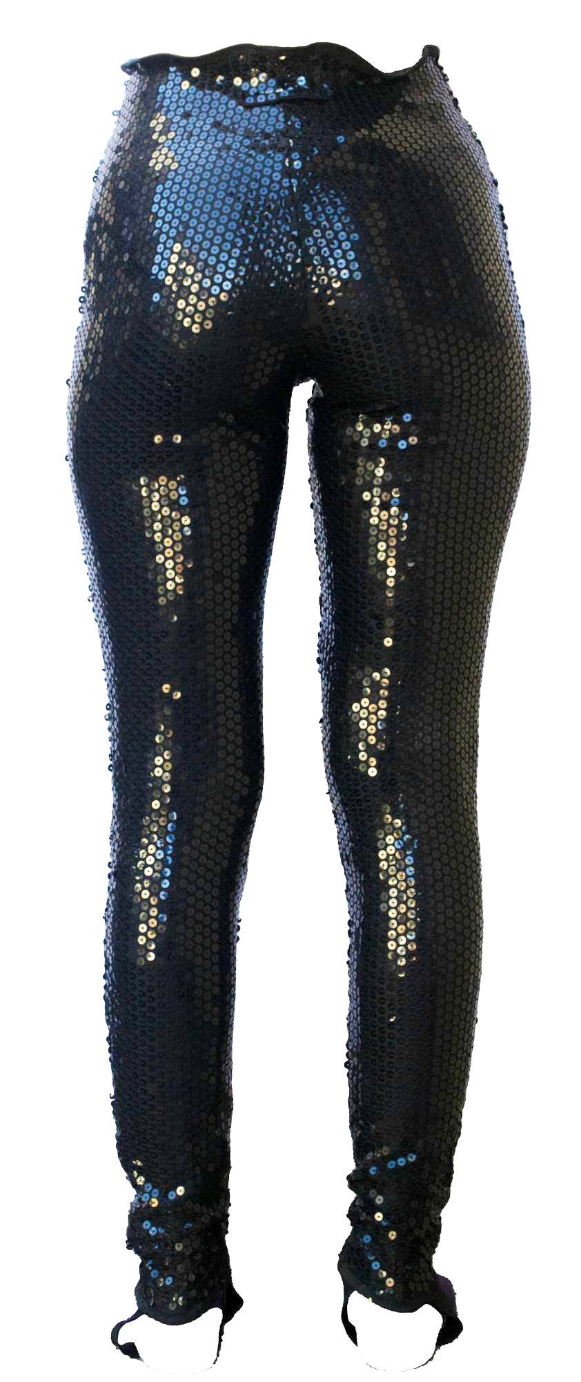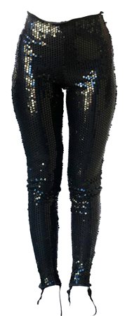 Leggings nero in paillettes elasticizzato con ghette e abbottonatura interna per bretelle. Prodotto in Italia negli anni '80 Taglia IT 42. Perfettamente conservato