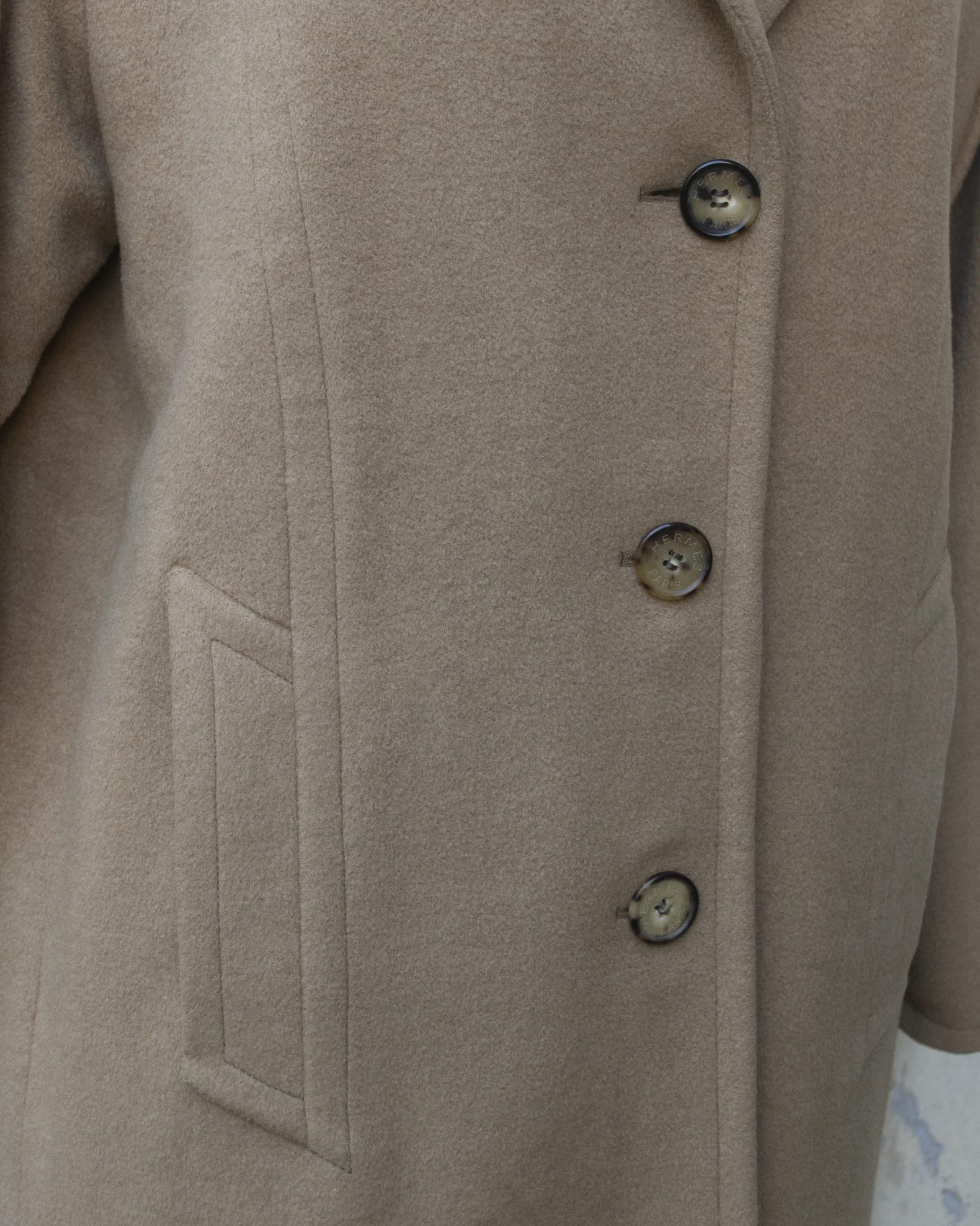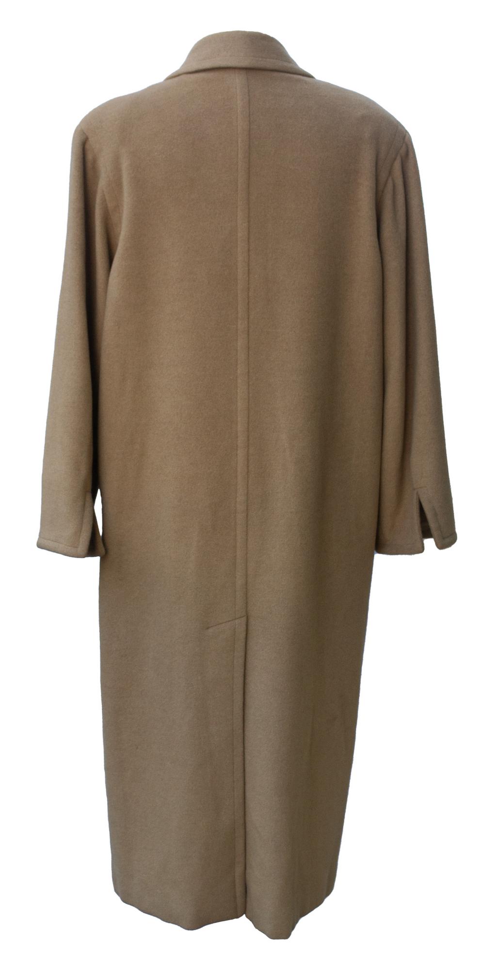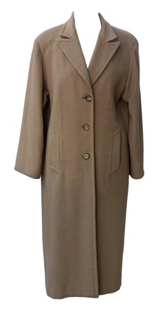 Camelhair fabric for this long lined coat. V shaped, shoulder with shoulderpads, two side welt pockets, striped and branded jacquard lining, horn buttons .Made in France in the early 90s. Size IT 42. Perfectly preserved