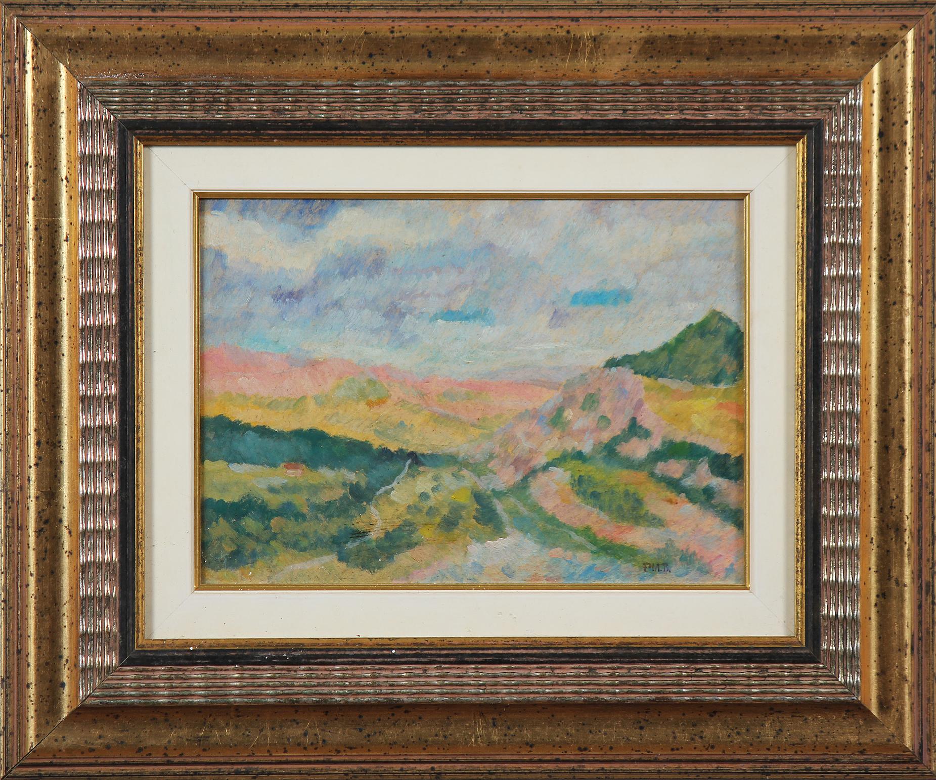 ANONIMO Paesaggio. Olio su cartone. Cm 31,00 x 22,00. Monogrammato P M B.....