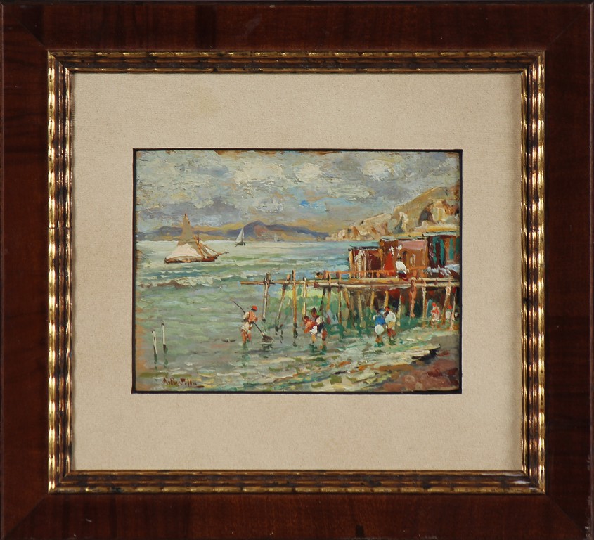 PRATELLA ATTILIO (1856 - 1949) Molo con barche a vela. Olio su tavola. Cm 15,50 x 11,50. Firma in basso a sinistra. Cornice presente