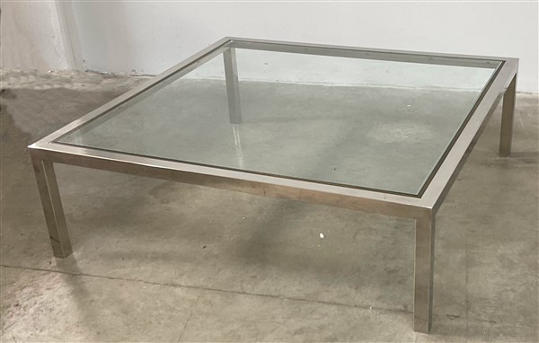 Tavolo da salotto in metallo cromato con piano in vetro. Italia, anni '70. (cm 120x37x120) (difetti)