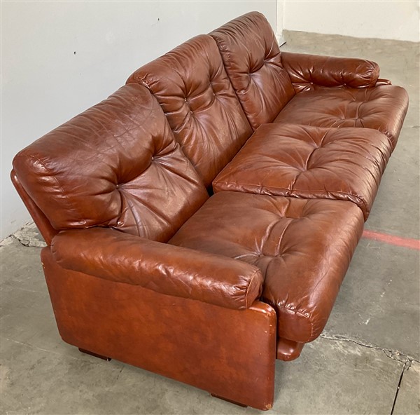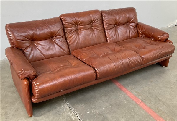 Divano a tre posti in vinilpelle marrone. Italia, anni '70/'80. (cm 210x69x90) (difetti)
