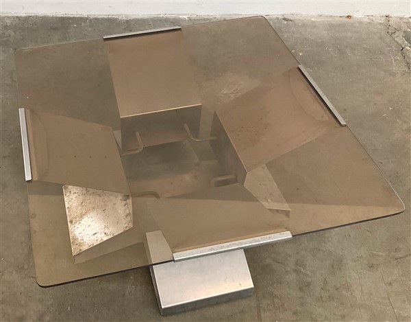 Tavolo basso. Francia, anni '70. Lastre calandrate d'acciaio, piano in vetro leggermente molato. (cm 79x39x80) (lievi difetti)