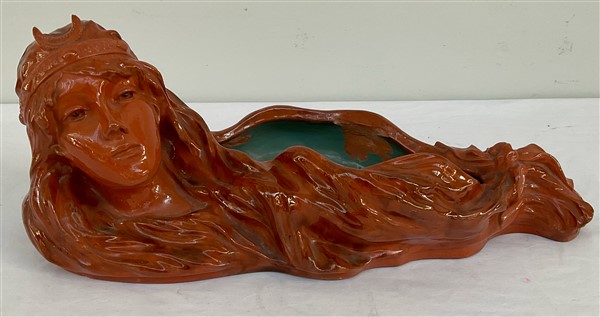Grande centrotavola Art Nouveau in terracotta smaltata in marrone sottovetrina raffigurante volto femminile. (cm 61x24) (difetti)