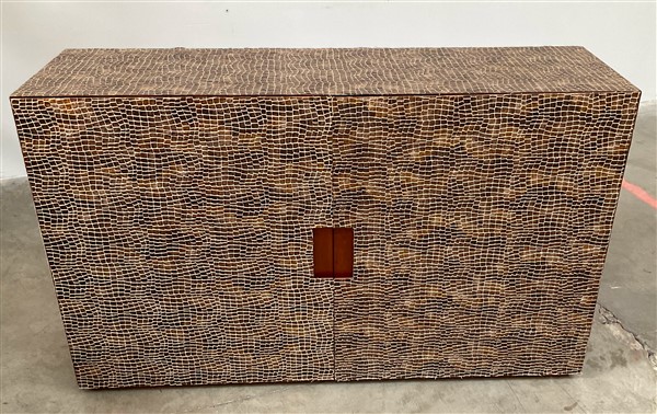 Credenza a due sportelli, struttura in compensato impiallacciato, rivestita in stoffa. Secolo XX. (cm 140x85x40) (lievi difetti)