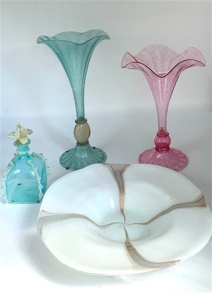 Lotto composto da due vasi a bulbo in vetro soffiato trasparente rosa e azzurro (h max cm 40), una bottiglia con tappo in vetro soffiato trasparente blu e bianco (h cm 22) e un piatto in vetro soffiato lattimo (d cm 38). Secolo XX. (difetti)