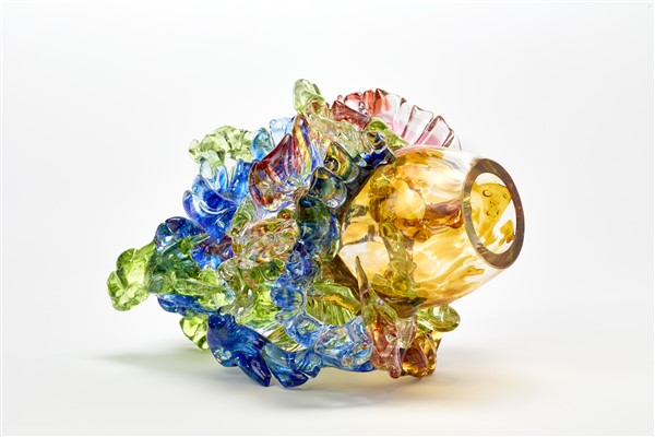 Centrotavola scultura in vetro soffiato con filamenti trasparenti policromi. Anni '80. (h cm 27)