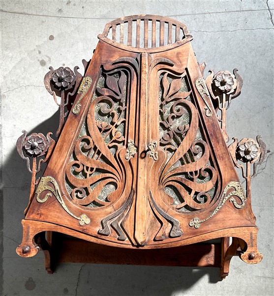Pensile Liberty in legno massello intagliato con decori geometrici e floreali. Corpo trapezoidale, due ante a vetri verdi e decoro intagliato a traforo guarnizioni in ottone martellinato. Italia, 1900ca. (difetti e piccoli restauri)