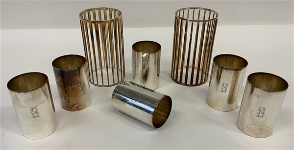 Lotto composto da sei contenitori monogrammati e due fasce a ringhiera in metallo argentato. Bregnano, seconda metà secolo XX. (cm h 9,3; cm h 15)