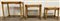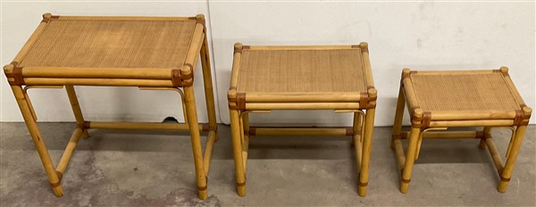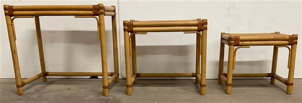 Gruppo di tre tavolini a nido in manao scortecciato, midollino e fasce in cuoio. Misure diverse. Italia, anni '60. (difetti)