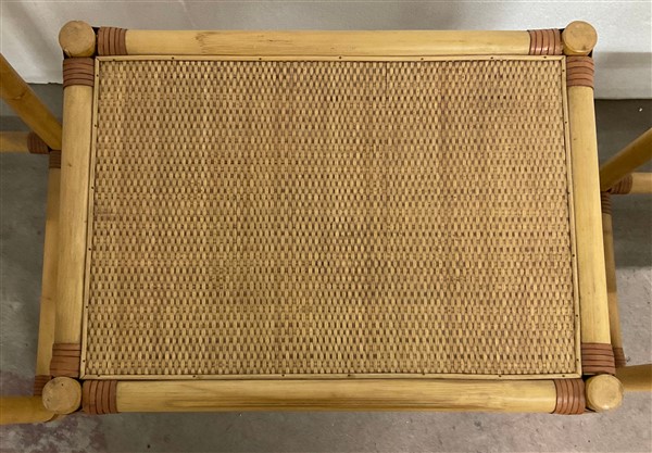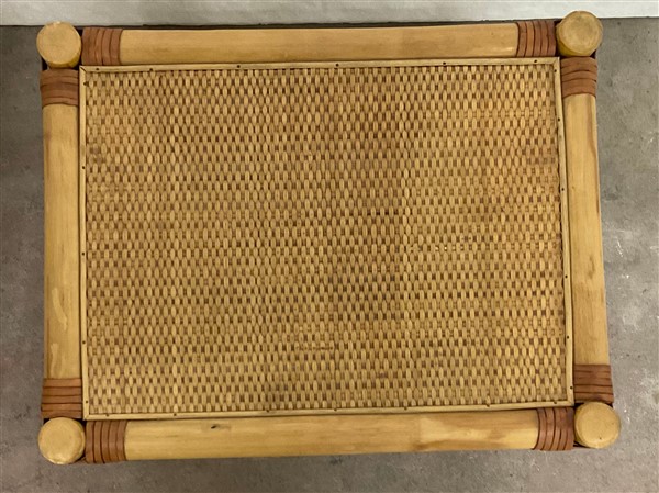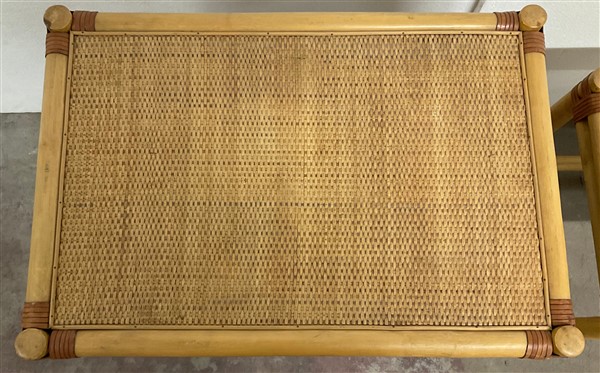 Gruppo di tre tavolini a nido in manao scortecciato, midollino e fasce in cuoio