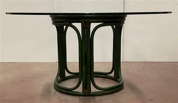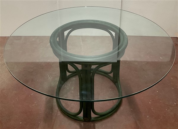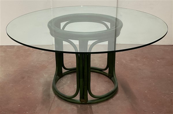 Tavolo tondo in giunco, malacca e scortecciato verniciato verde con piano in vetro. Italia, anni '70. (h cm 73; d cm 150) (difetti)