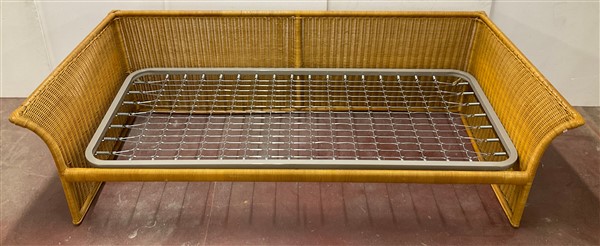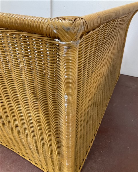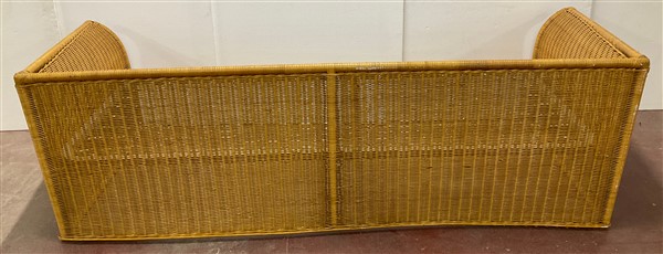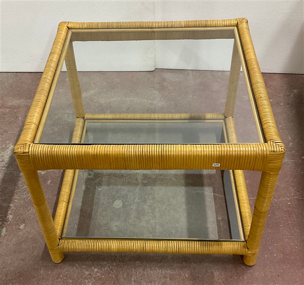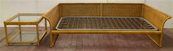Lotto composto da un divano ed un tavolino in midollino con ripiani in vetro. I