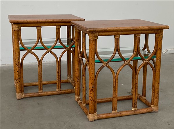 Coppia si tavolini in manao scortecciato e malacca, ripiani in cristallo. Produzione McGuire Company, Italia, anni '70. (cm 56x41x62) (lievi difetti)