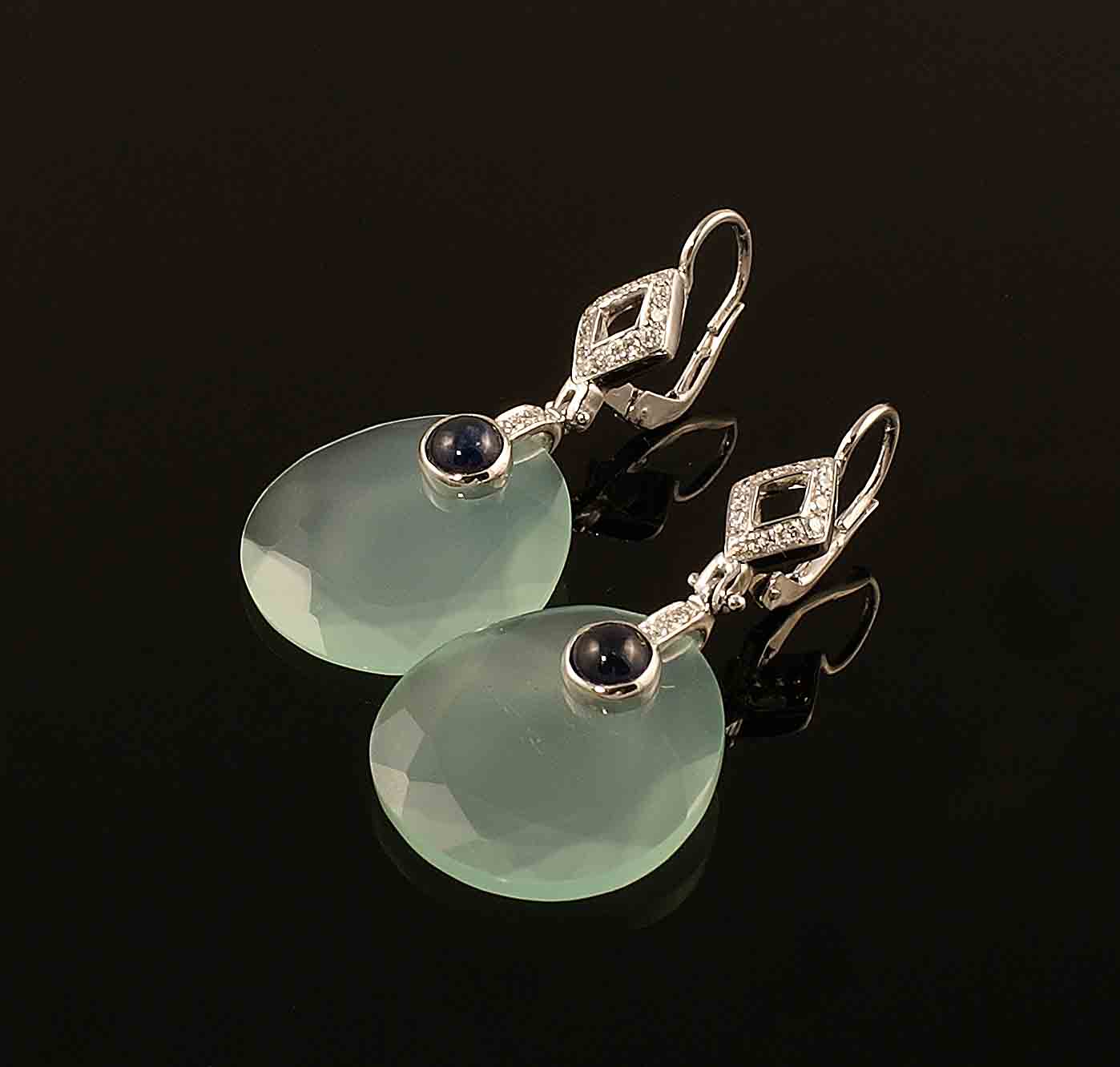 Orecchini pendenti a monachina in oro bianco 18kt con incastonate due gocce briolet di agata celeste, due zaffiri cabochon per carati 1,70 circa e diamanti taglio brillante per 0,30 punti circa, gr. 11,9.