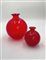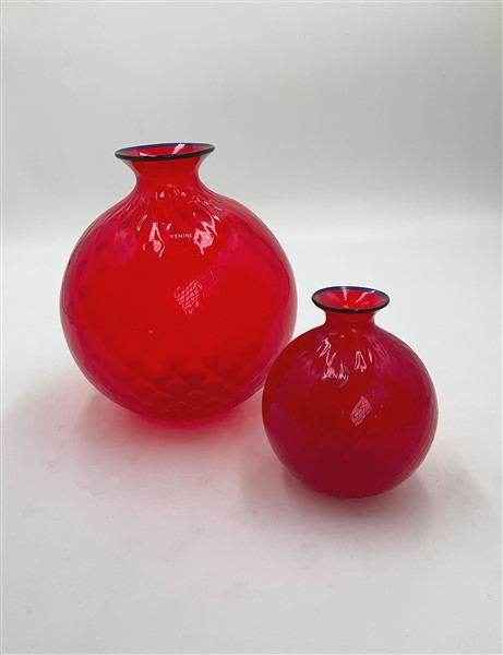Due vasi globulari della serie "Balloton". Murano, Anni 2003/2005. Vetro soffiato trasparente rosso con orlo blu applicato a caldo. Firmati a punta sotto la base. (h max cm 20)