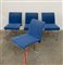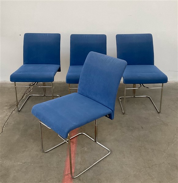 Gruppo di quattro sedie modello "P.15". Produzione Saporiti, Besnate, 1970. Struttura in tondino di acciaio cromato, seduta e schienale imbottiti celeste. (cm 45x87x60) (lievi difetti)