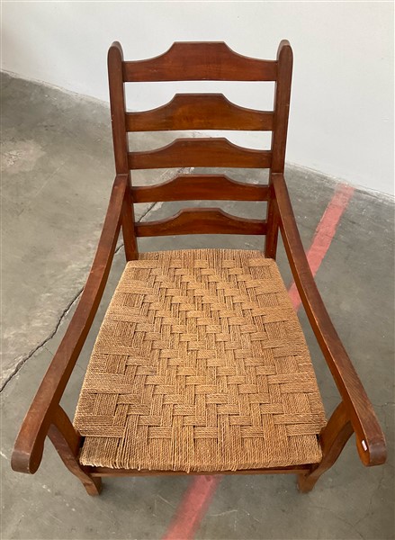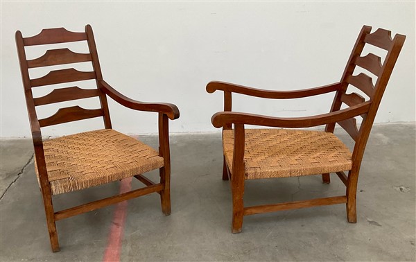 Coppia di poltrone Novecento da camino in legno con schienali a giorno e sedute in corda intrecciata. Italia, secolo XX. (cm 65,5x95x67) (lievi difetti)