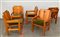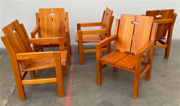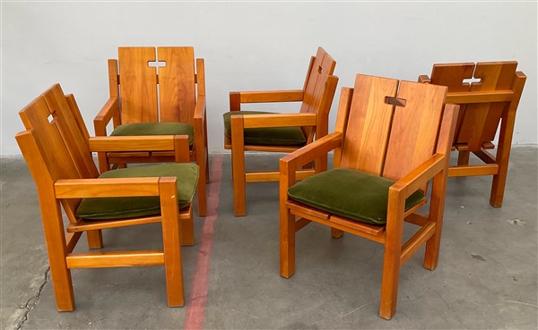 Gruppo di cinque poltroncine in legno massello di abete. Italia, anni '70. (cm 55,5x85,5x52) (lievi difetti)